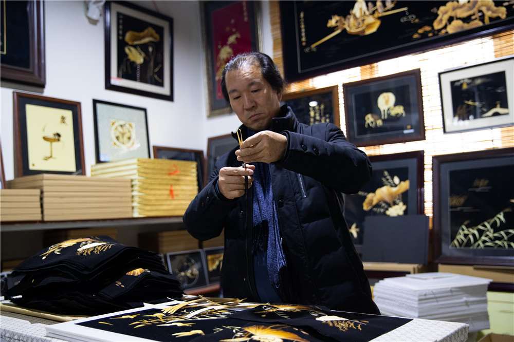 河北省非物质文化遗产芦苇画技艺传承人杨丙军在制作芦苇画(2019年1月8日摄)。新华社发(王京卓 摄)