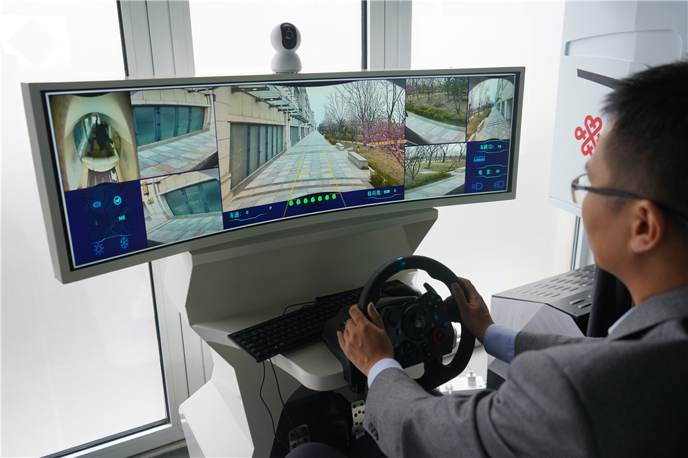 在雄安数字交通实验室,负责人任大凯对无人驾驶汽车进行远程操控(2021年3月26日摄)。新华社记者 金皓原 摄