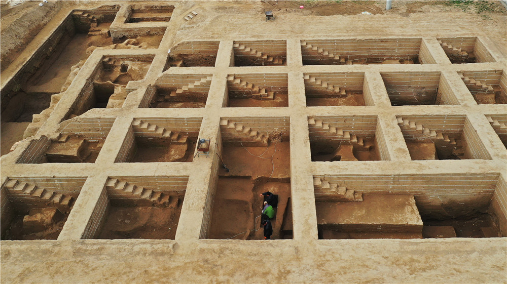 考古队员在河北雄安新区南阳遗址考古发掘现场工作(2021年3月19日摄,无人机照片)。新华社记者 牟宇 摄