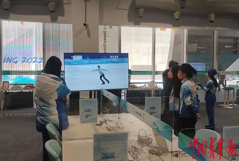 主新闻中心的志愿者在关注羽生结弦的比赛。中青报·中青网记者 杨屾摄