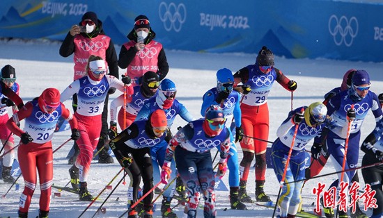 2月5日下午,河北张家口赛区国家越野滑雪中心,越野滑雪女子双追逐比赛现场,中国选手迪妮格尔·衣拉木江(29号)与世界各国选手同场竞技。在选手们身后有两位戴着口罩的工作人员正在用手机拍摄记录。这是迪妮格尔·衣拉木江的冬奥会首秀,她也是本届冬奥会开幕式上进行最后一棒传递的两位火炬手之一。中青报·中青网记者 李峥苨/摄