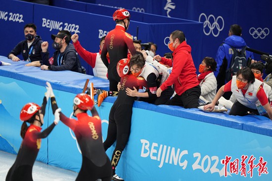 2月5日晚,北京首都体育馆,北京冬奥会短道速滑项目混合团体接力决赛结束后,中国队队员与教练员和工作人员一同庆祝夺冠。这也是中国队在北京冬奥会上夺得的首枚金牌。中青报·中青网记者 李隽辉/摄