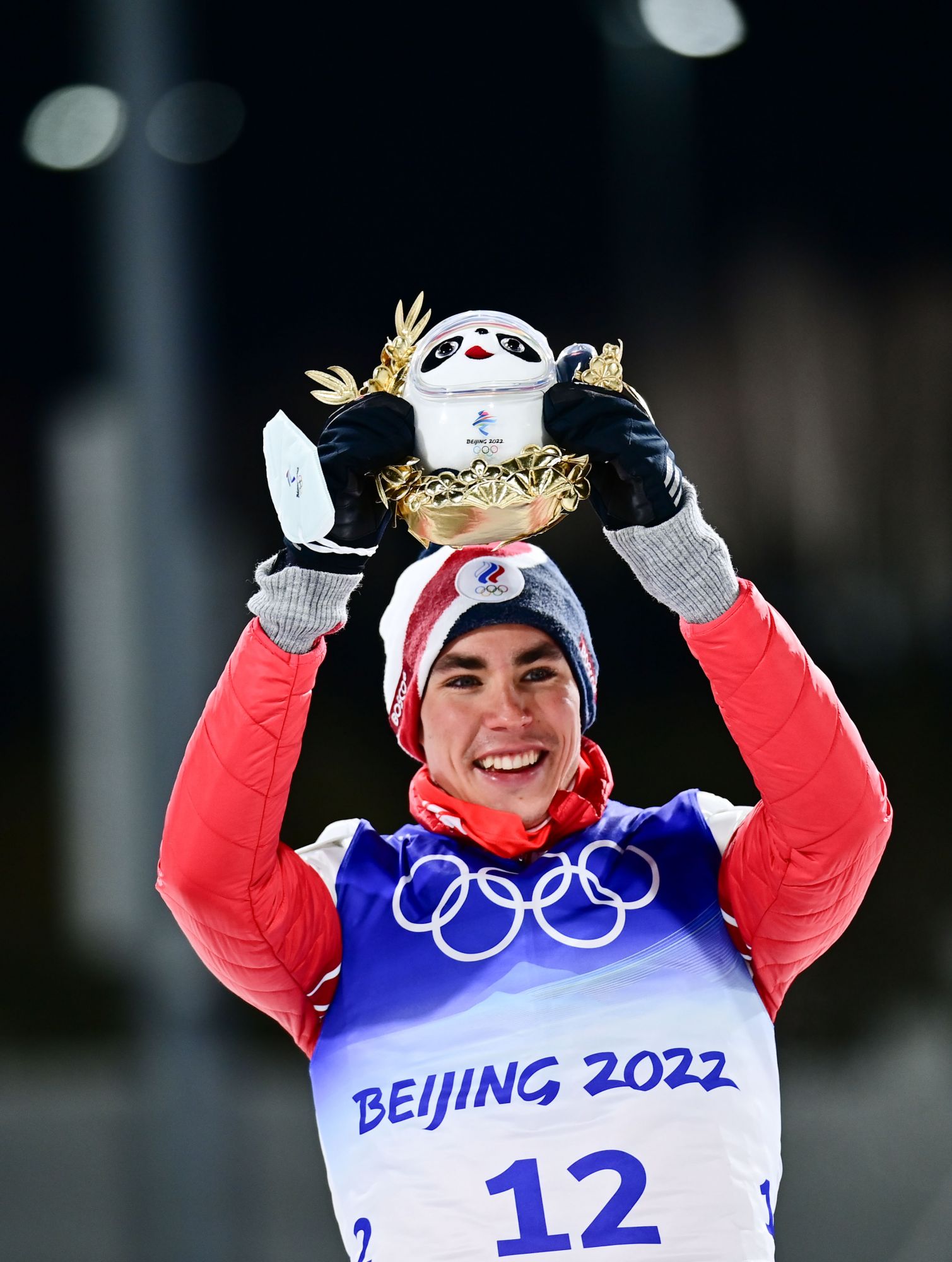 2月8日,越野滑雪男子个人短距离(自由技术)季军、俄罗斯奥委会选手亚历山大·捷连捷夫在颁发纪念品仪式上高举金色冰墩墩。