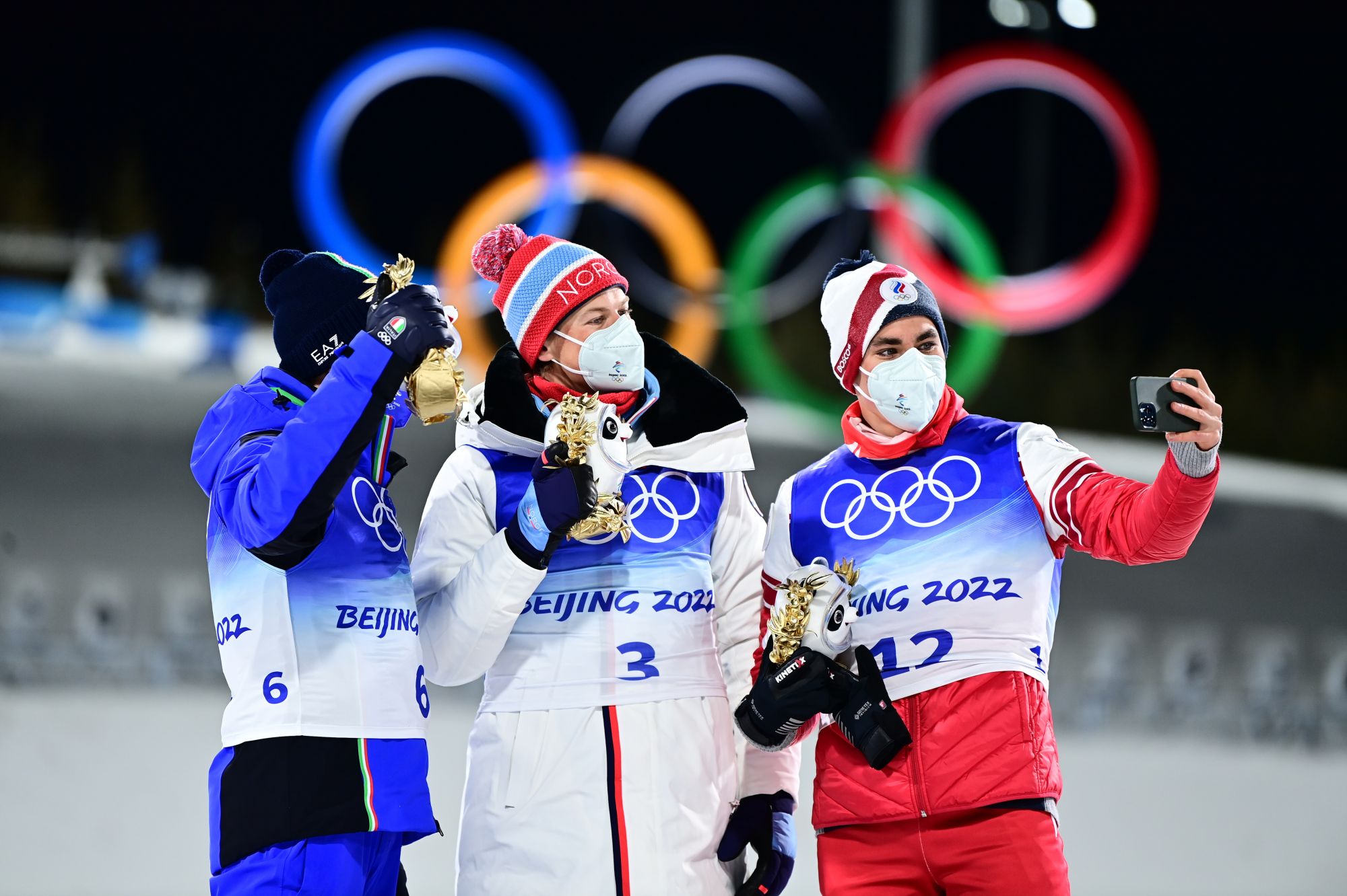 2月8日,越野滑雪男子个人短距离(自由技术)冠军挪威选手约翰内斯·赫斯弗洛特·克莱博(中)、亚军意大利选手费代里科·佩莱格里诺(左)、季军俄罗斯奥委会选手亚历山大·捷连捷夫在颁发纪念品仪式上与金色冰墩墩自拍合影。