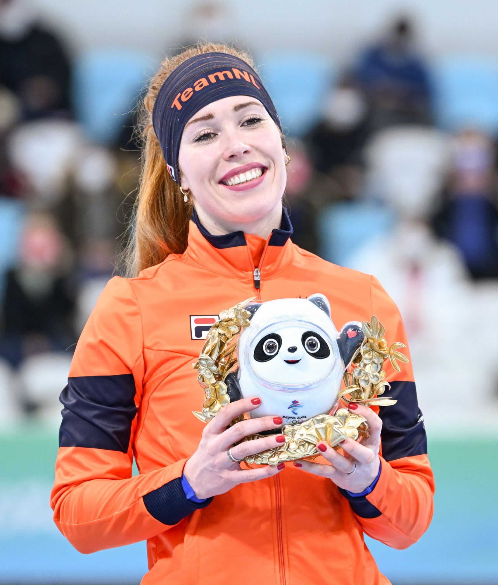 2月7日,速度滑冰女子1500米季军、荷兰选手安托瓦尼特·德容赫在颁发纪念品仪式上手捧金色冰墩墩。