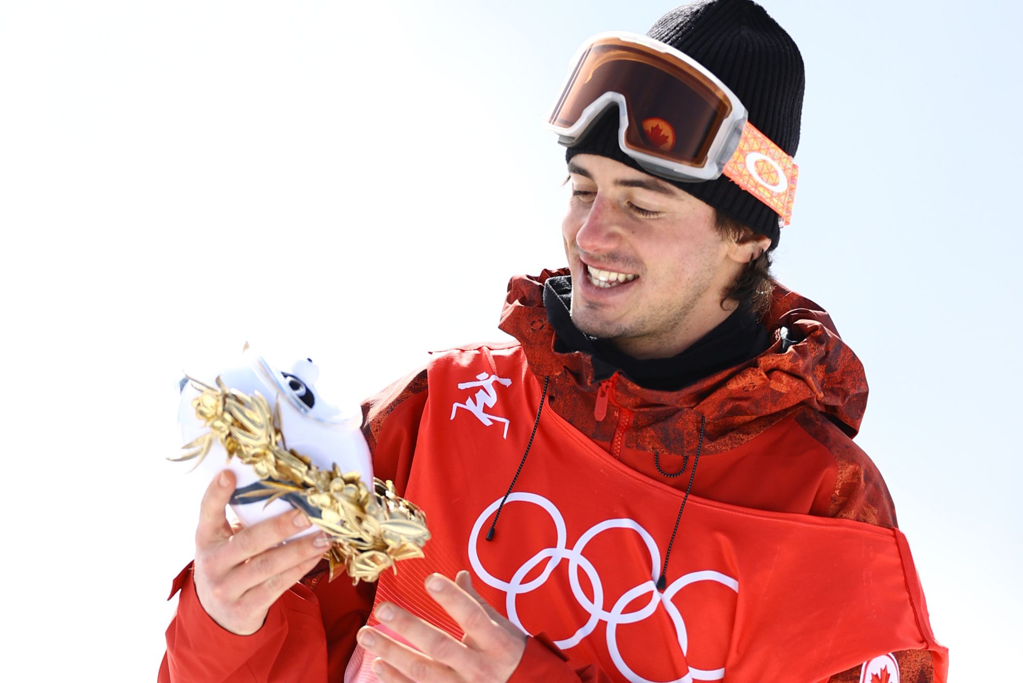 2月7日,单板滑雪男子坡面障碍技巧季军、加拿大选手马克·麦克莫里斯在颁发纪念品仪式上端详金色冰墩墩。