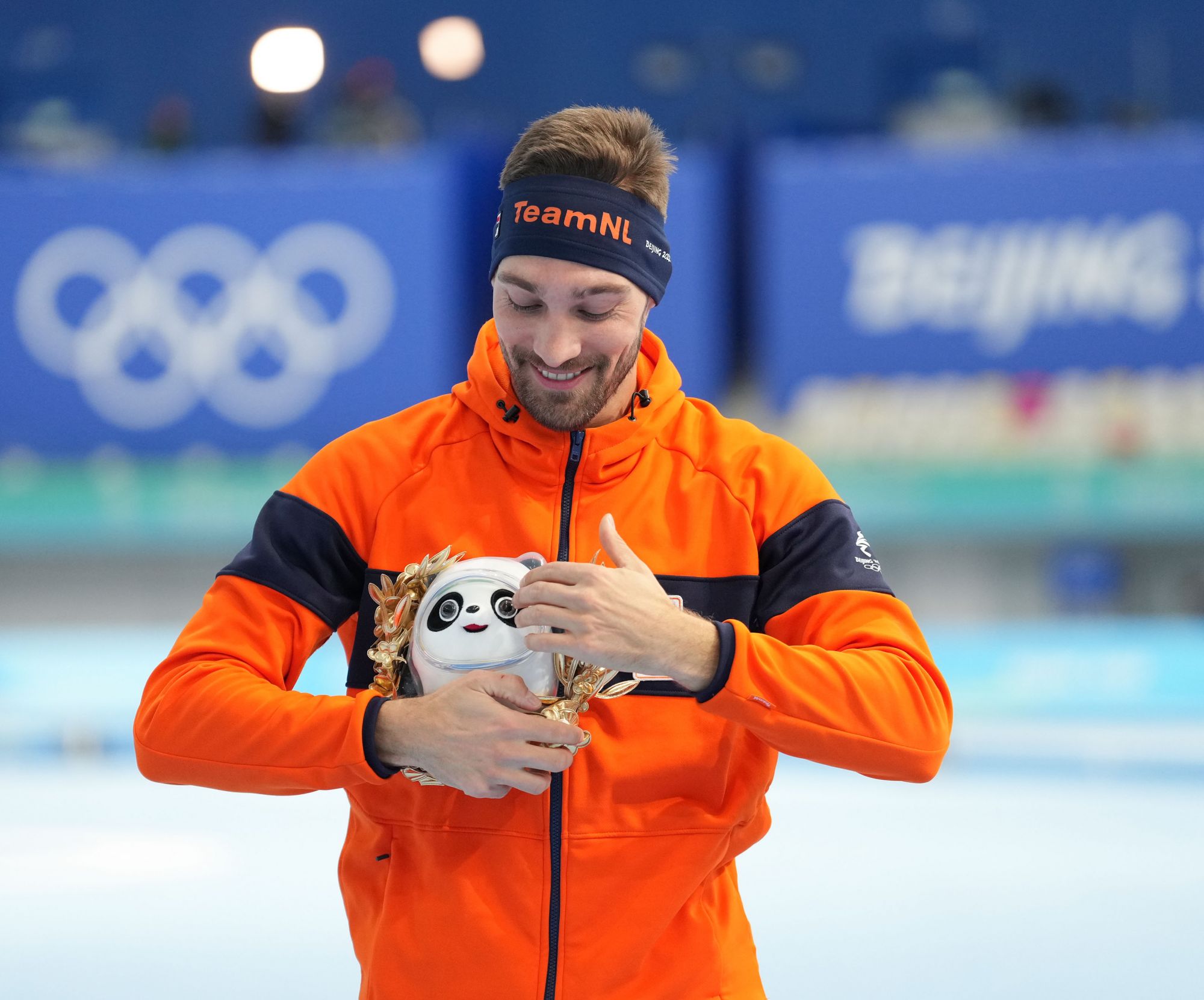 2月8日,速度滑冰男子1500米冠军、荷兰选手凯尔·内斯在颁发纪念品仪式上看着手中的金色冰墩墩。