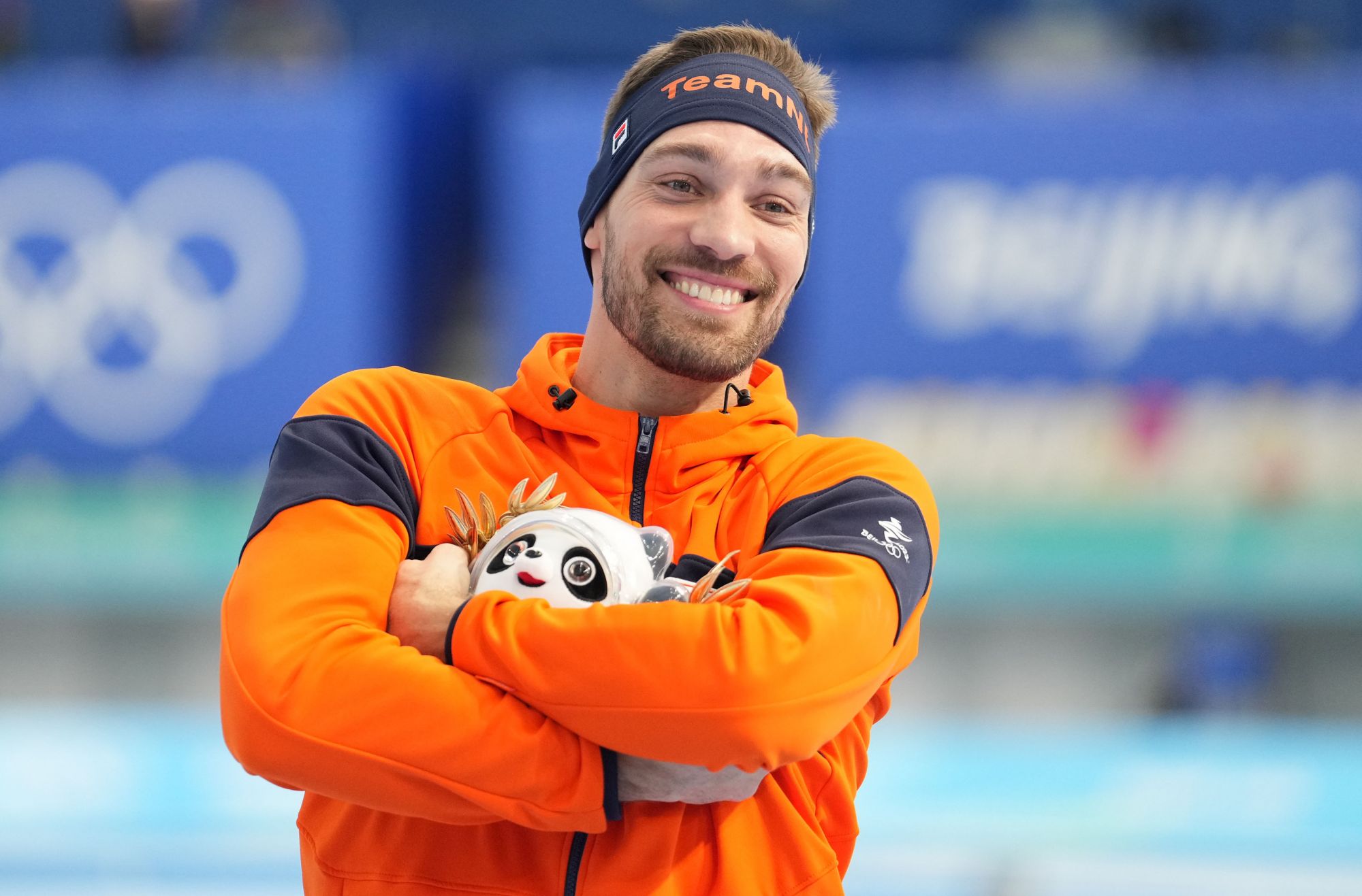 2月8日,速度滑冰男子1500米冠军、荷兰选手凯尔·内斯在颁发纪念品仪式上抱紧金色冰墩墩。