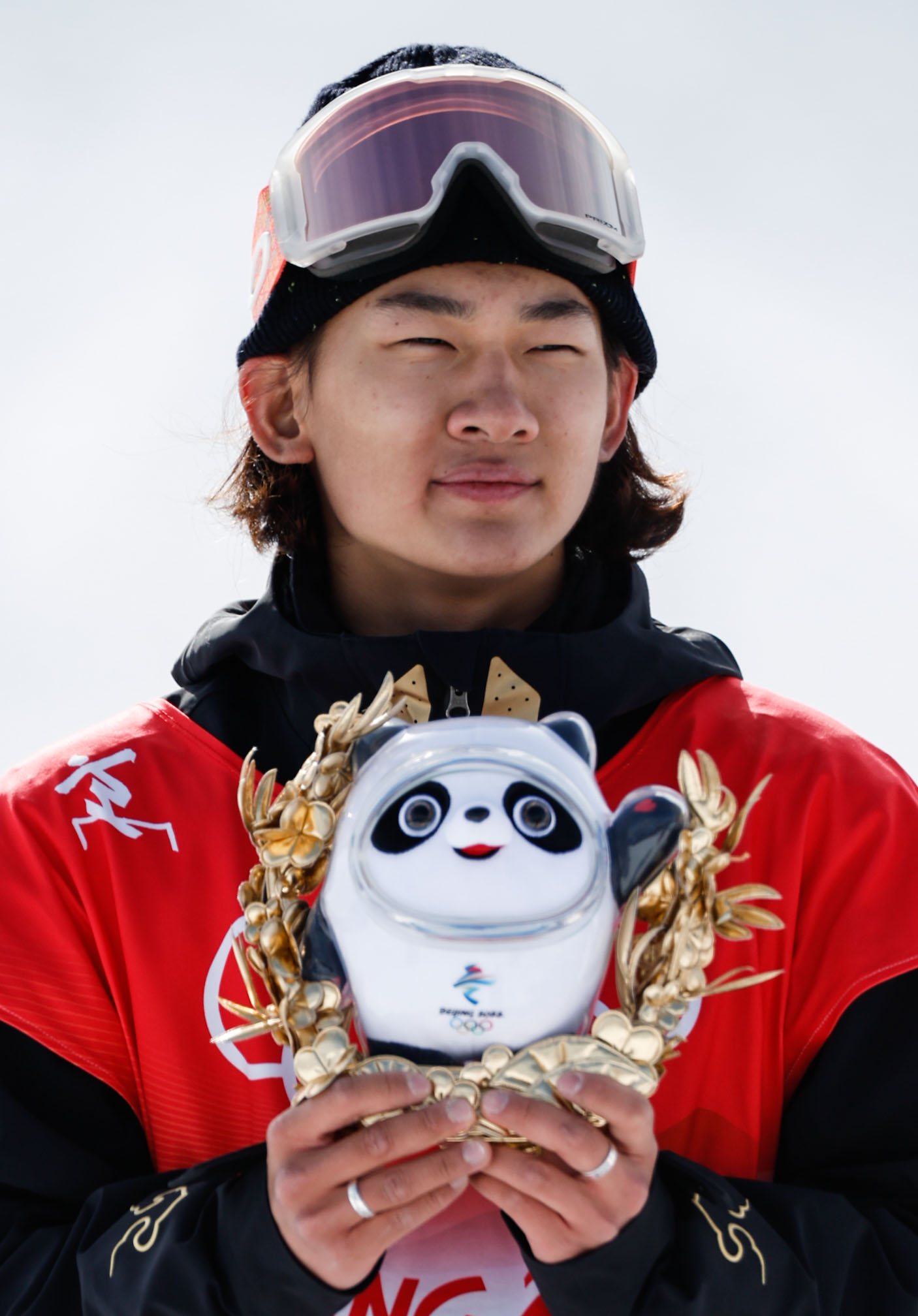 单板滑雪项目男子坡面障碍技巧亚军、中国选手苏翊鸣在颁发纪念品仪式上手捧金色冰墩墩。