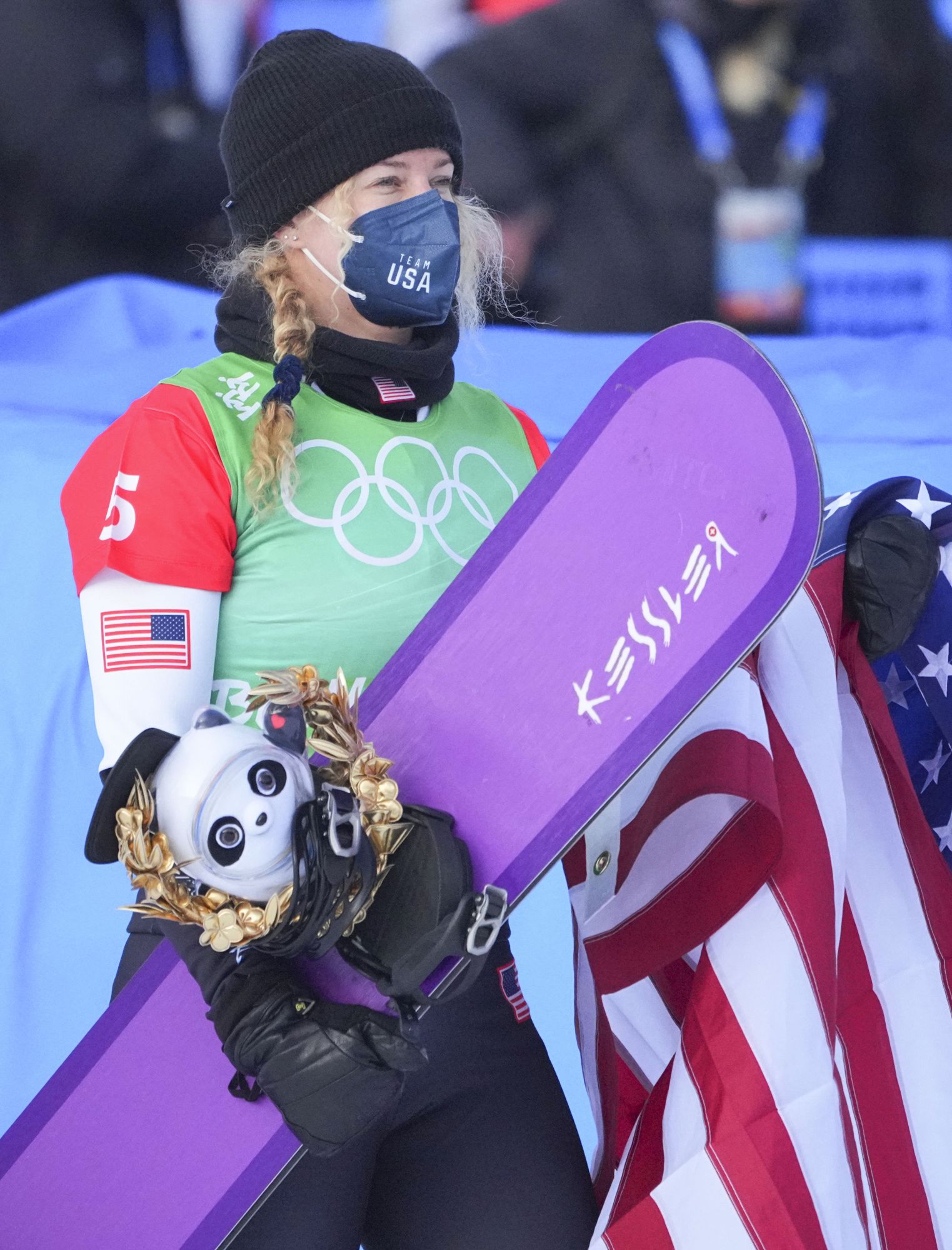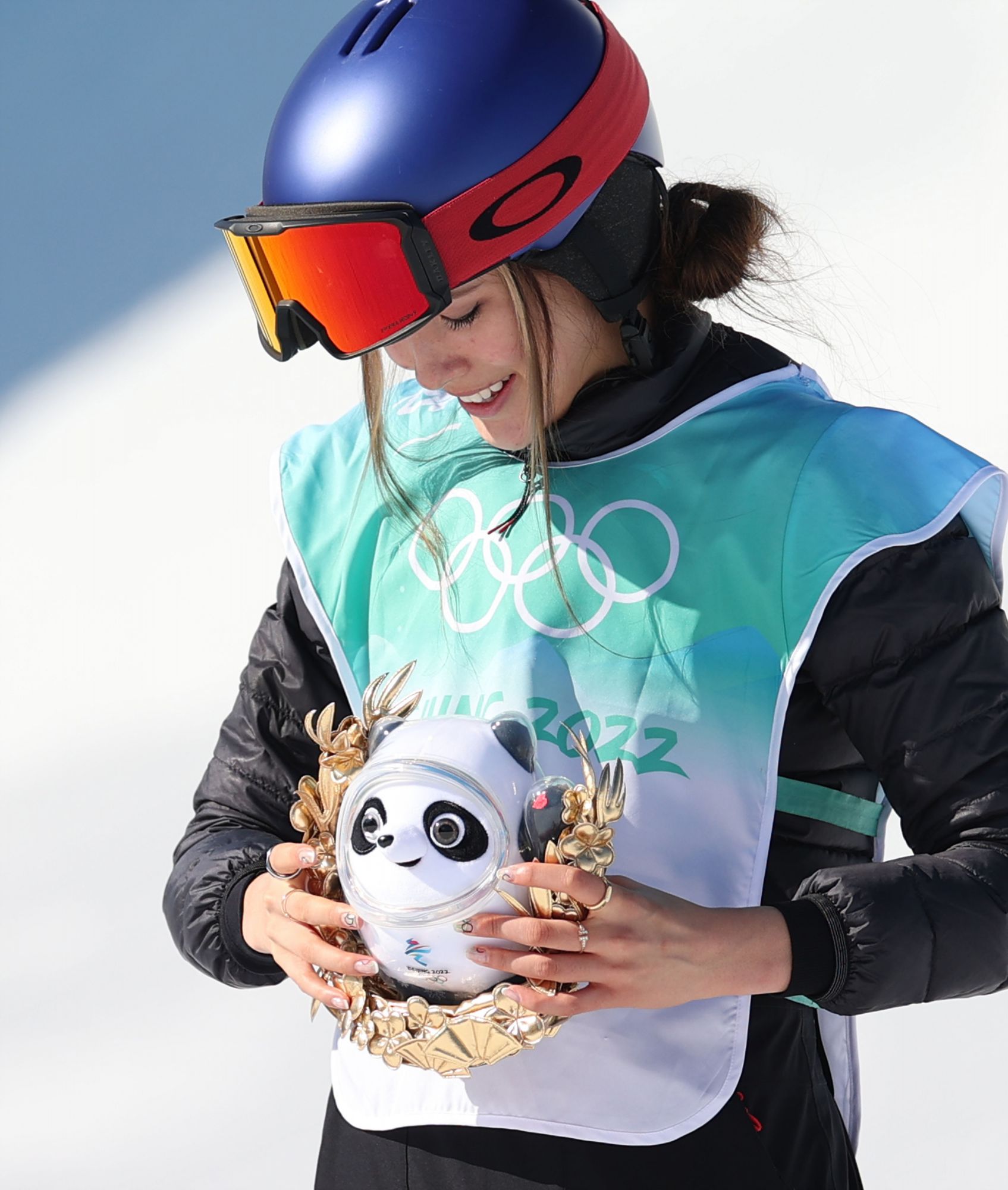 2月9日,单板滑雪女子障碍追逐赛冠军、美国选手琳赛·雅各贝利斯在颁纪念品仪式后带着金色冰墩墩离场。