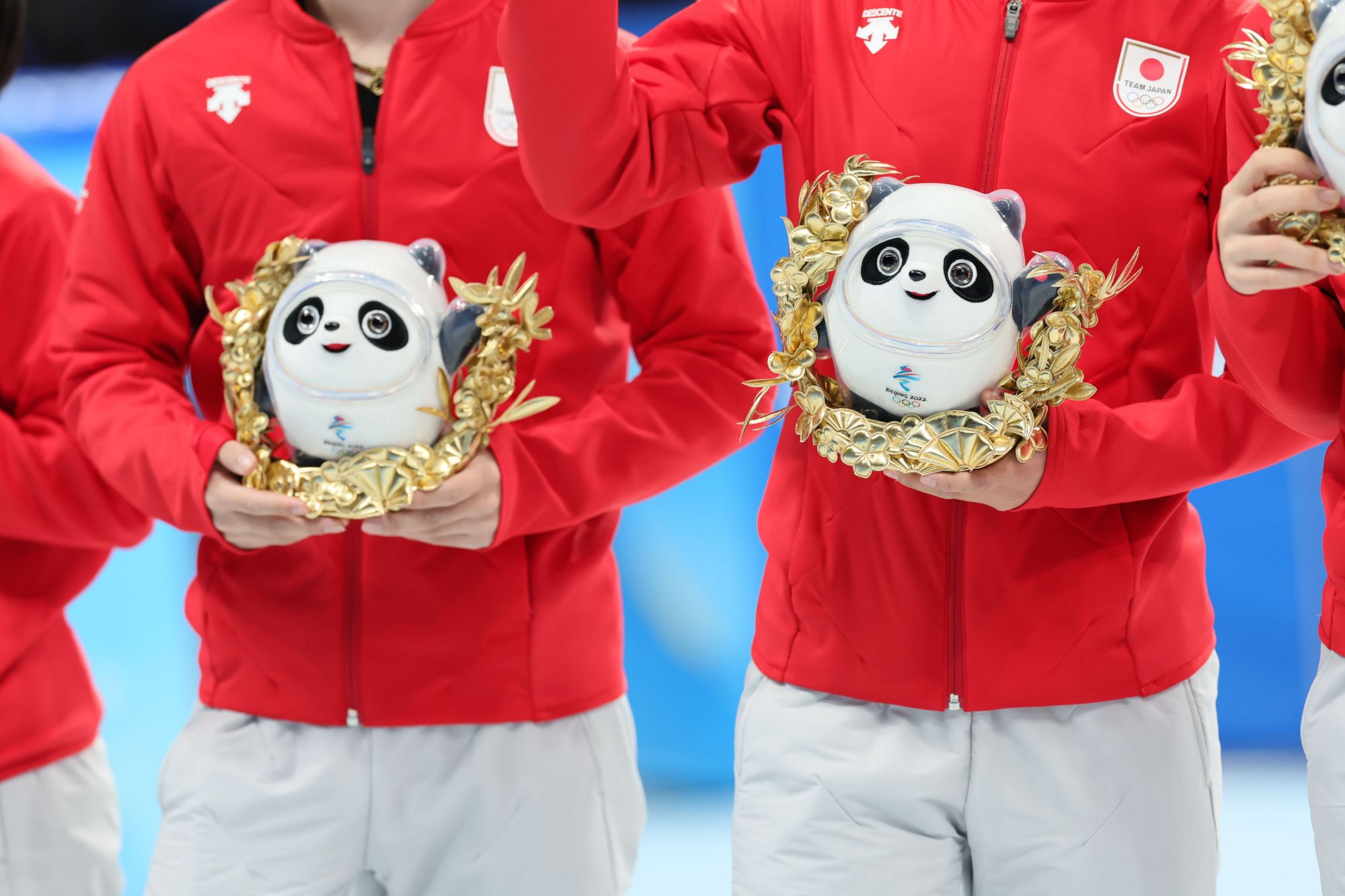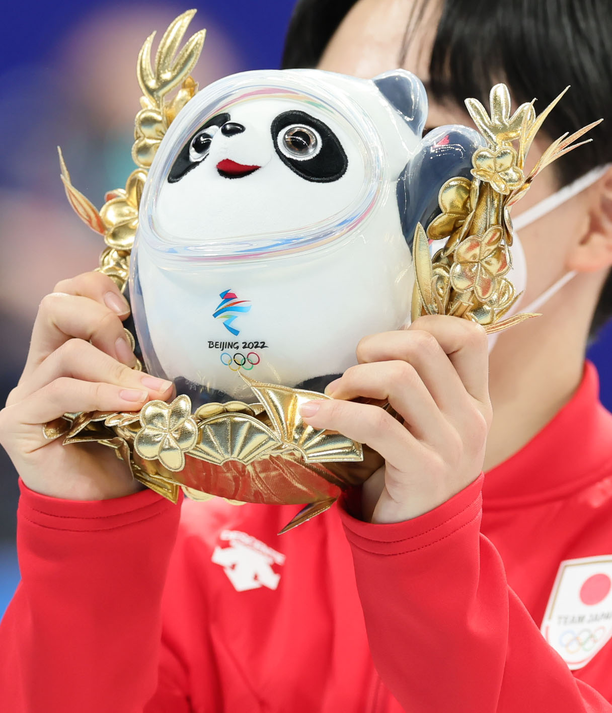 2月7日,花样滑冰团体赛季军、日本队选手在颁发纪念品仪式上手捧金色冰墩墩。