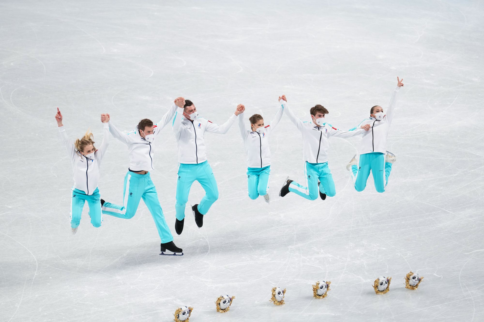 2月7日, 花样滑冰团体赛冠军、俄罗斯奥委会队选手在颁发礼品仪式上拍照时将金色冰墩墩摆成一排。
