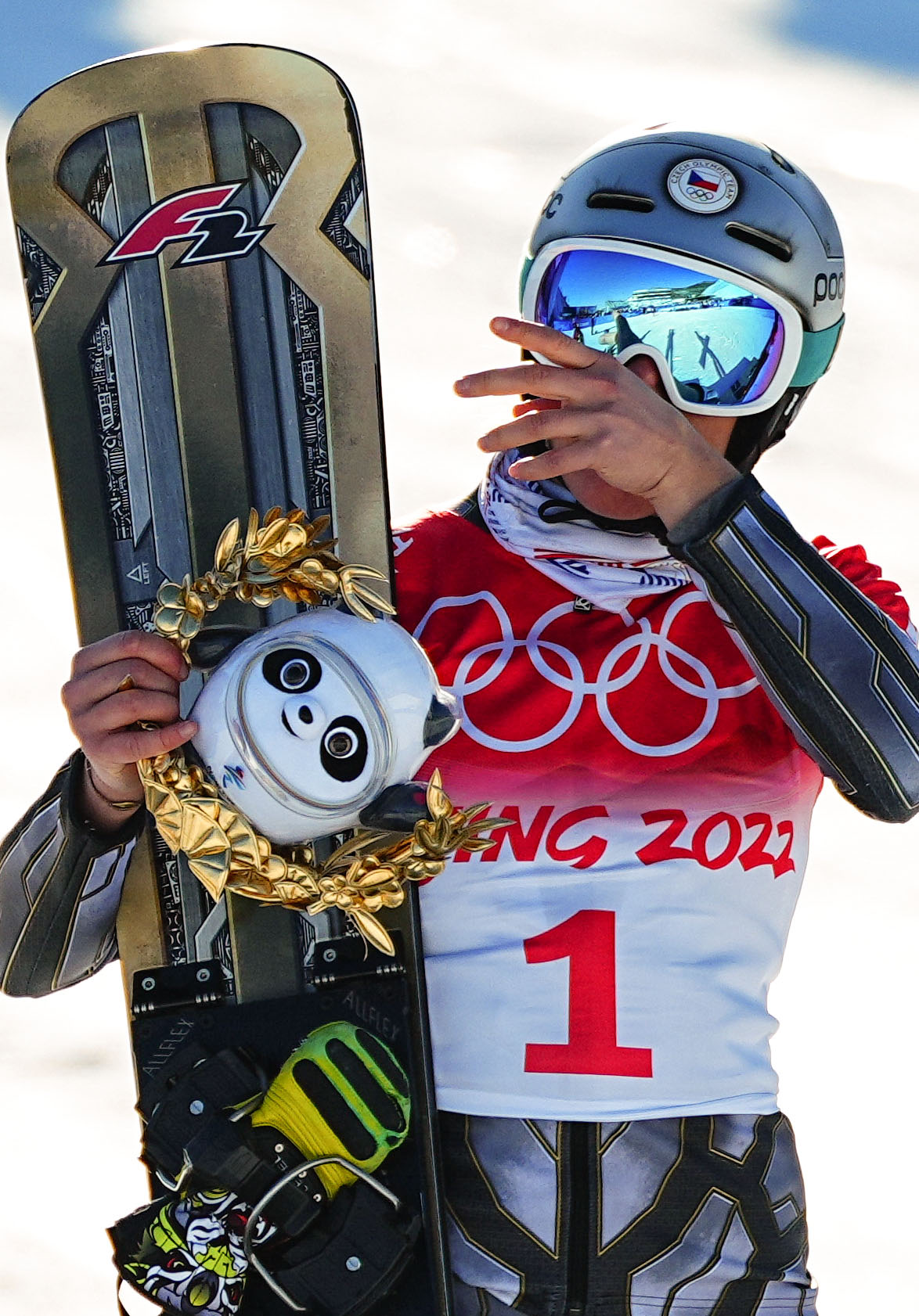 ↑2月8日,自由式滑雪女子大跳台冠军、中国选手谷爱凌在颁发纪念品仪式上高举金色冰墩墩。