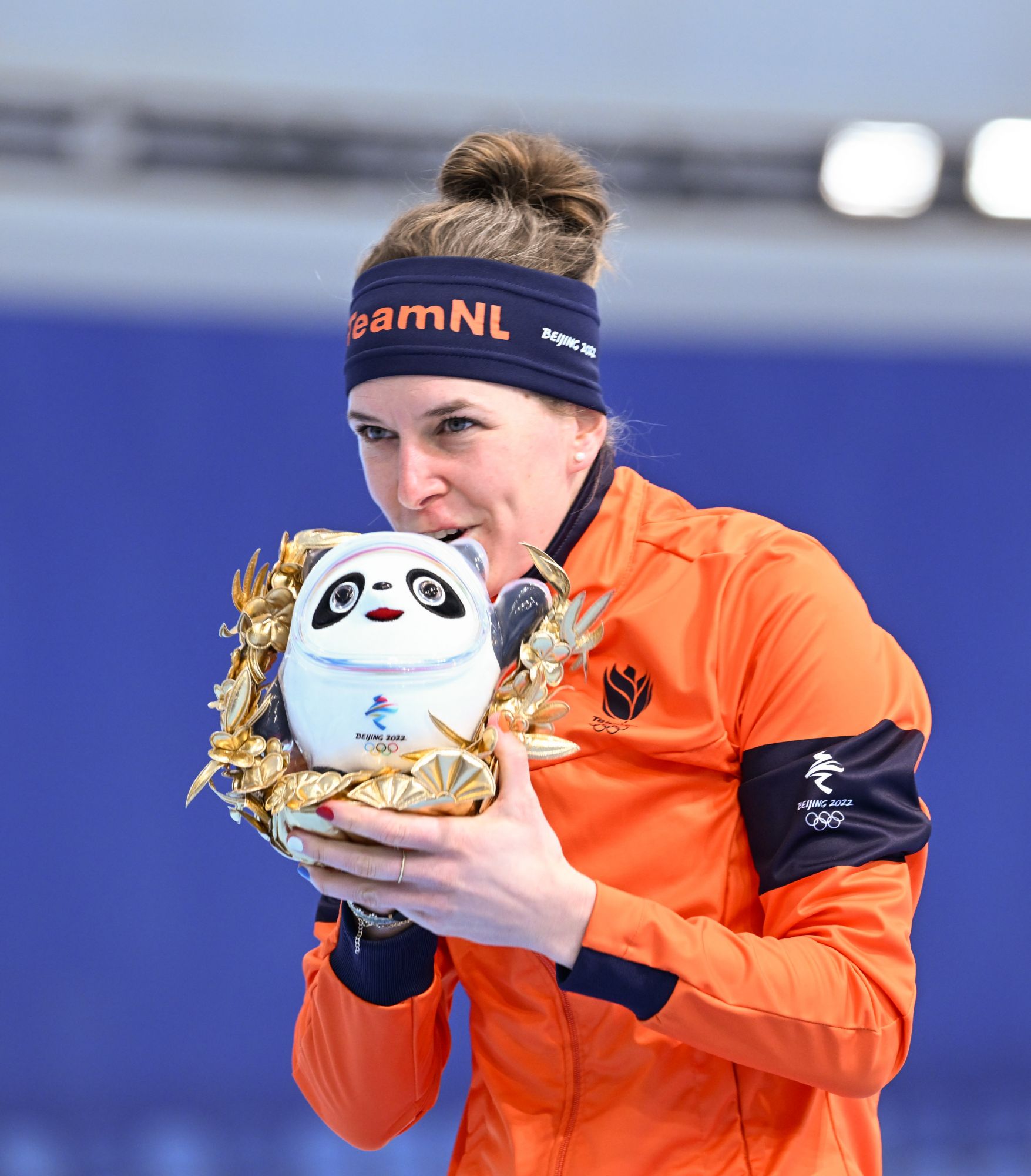 2月7日,速度滑冰女子1500米冠军、荷兰选手伊琳·维斯特在颁发纪念品仪式上亲吻金色冰墩墩。