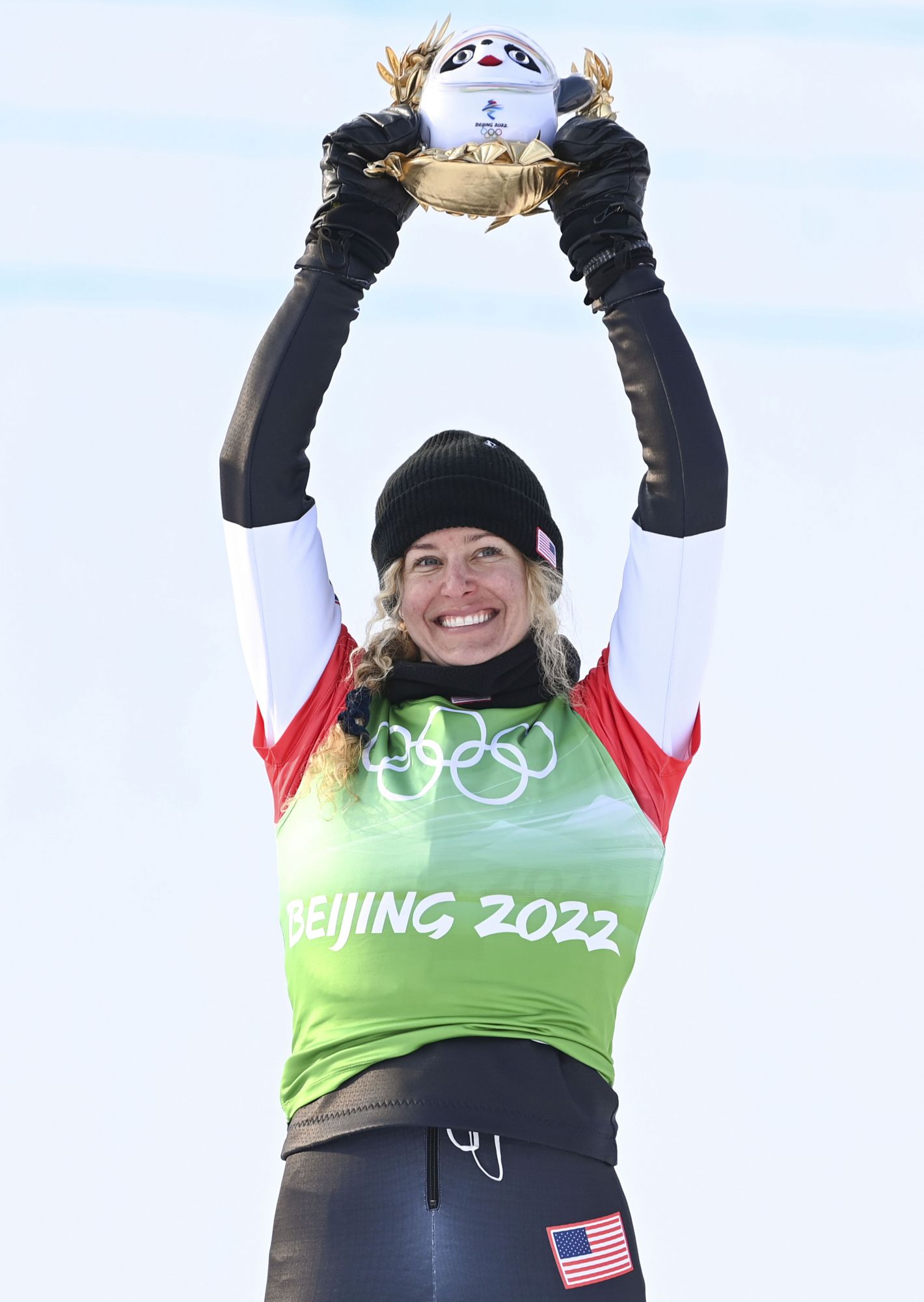 2月9日,单板滑雪女子障碍追逐赛冠军、美国选手琳赛·雅各贝利斯在颁发纪念品仪式上高举金色冰墩墩。