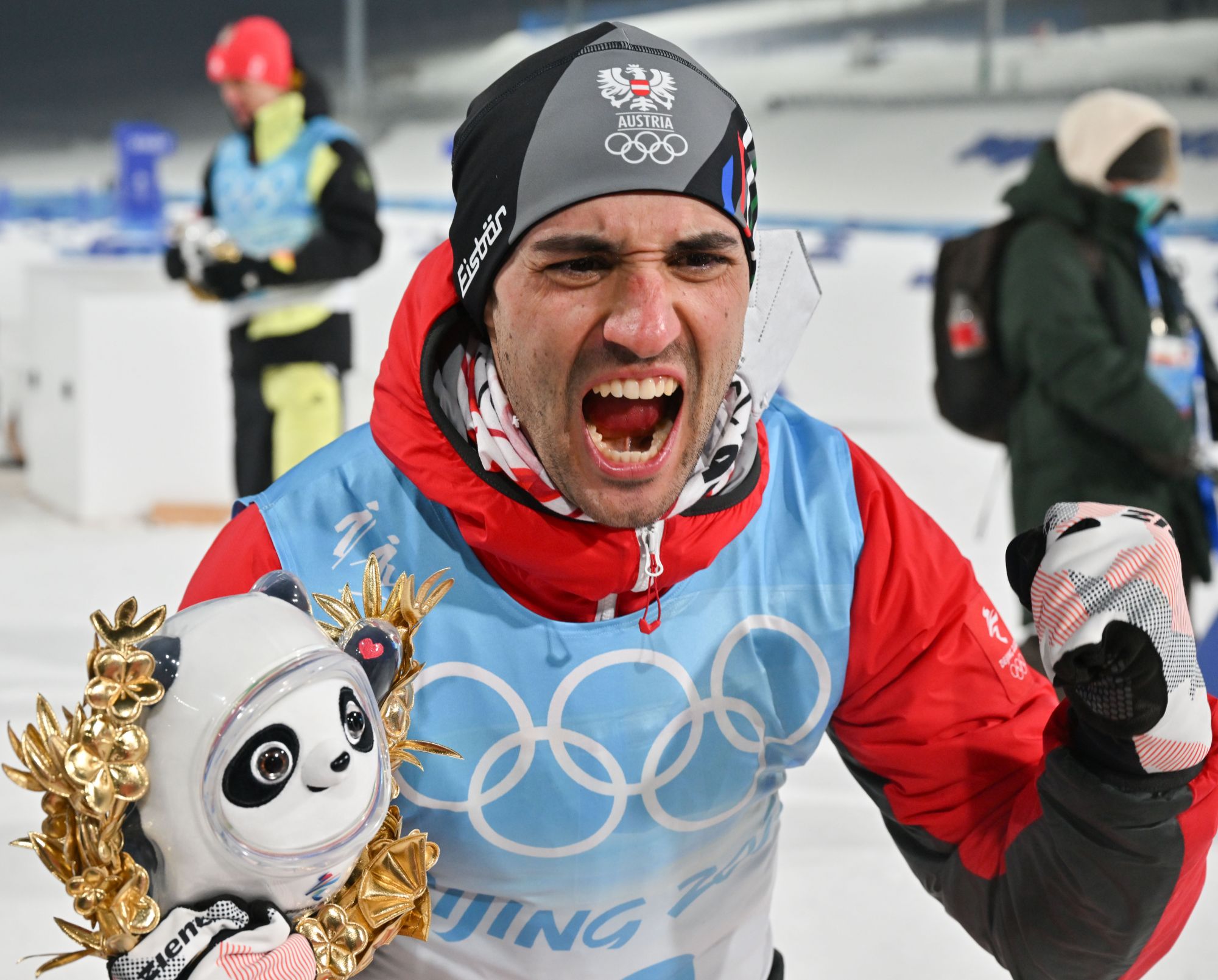 2月9日,北欧两项个人跳台滑雪标准台/越野滑雪季军、奥地利选手卢卡斯·格赖德雷尔在颁发纪念品仪式上。