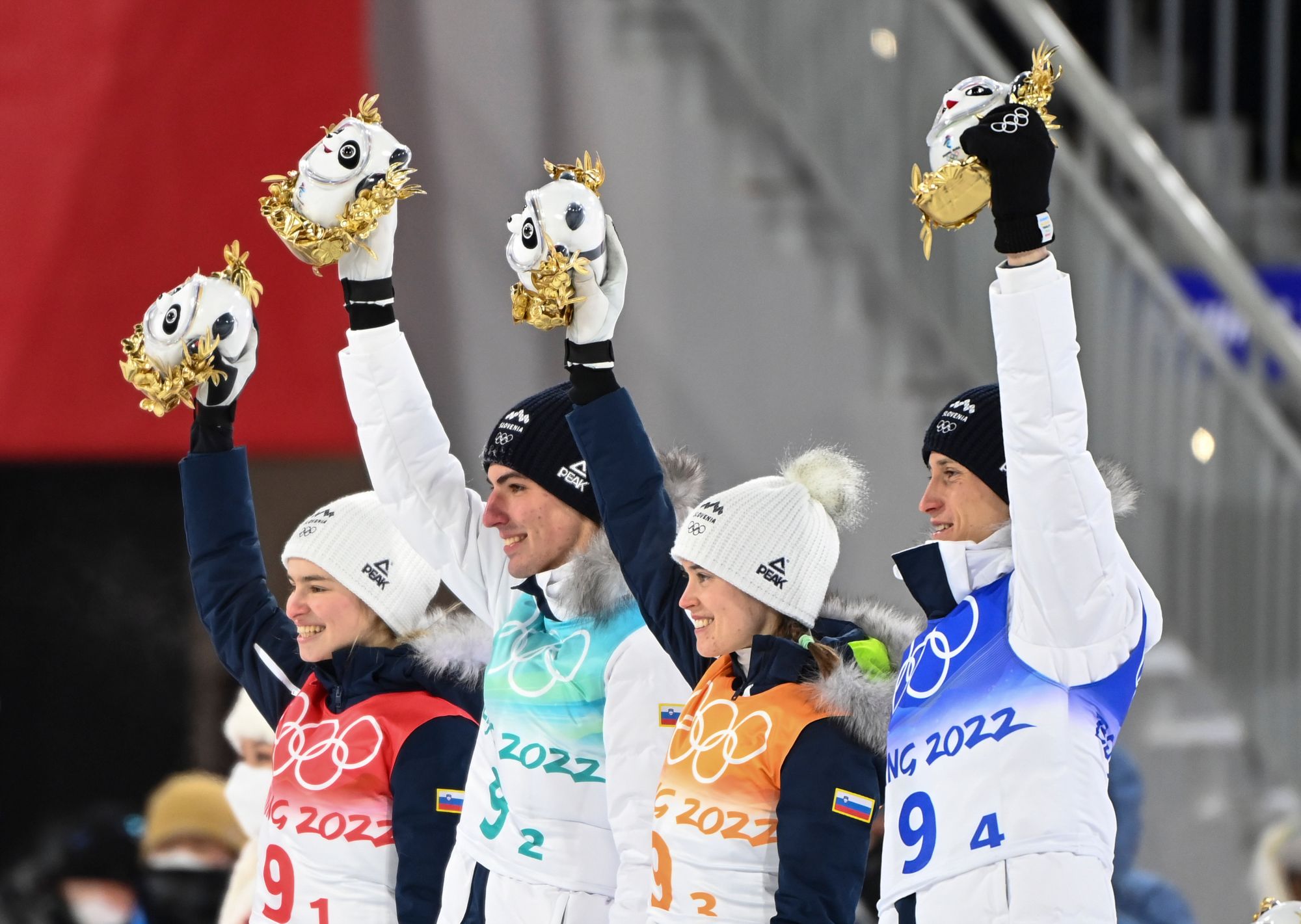 2月7日,跳台滑雪混合团体赛冠军、斯洛文尼亚队选手在颁发纪念品仪式上集体高举金色冰墩墩。