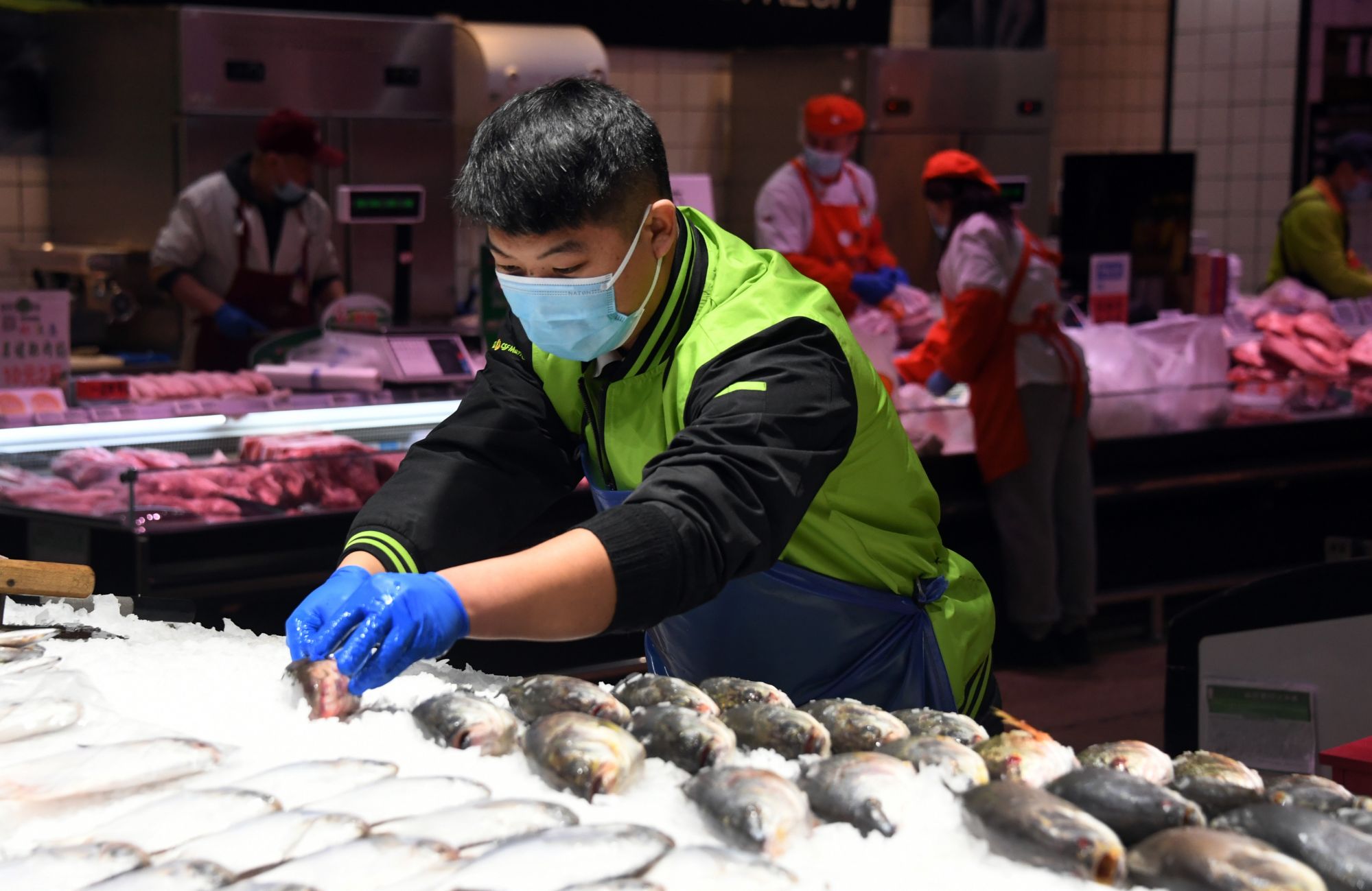 2021年12月31日,在北京市海淀区一家超市,工作人员码放水产品。 新华社记者任超 摄