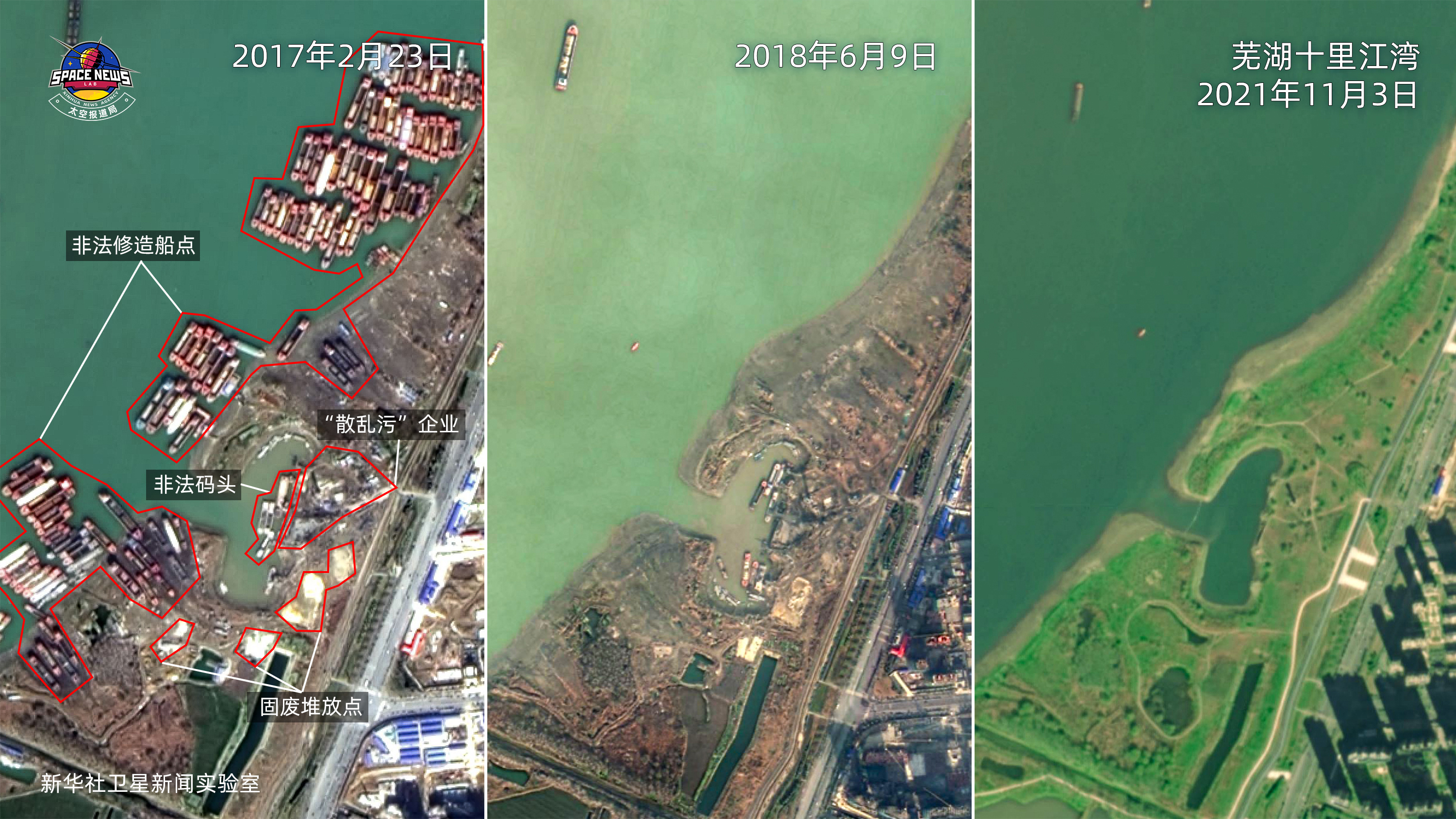芜湖十里江湾便是其中之一。卫星“跨越时空”拍摄的图片显示,芜湖十里江湾船舶中介、运输繁荣一时,导致固废堆放、岸边毁绿种菜等乱象丛生。2021年11月3日的卫星图显示,这里拥挤杂乱的工厂、渔船和裸露的地块均已消失,宛如披上一层“绿衣”,郁郁葱葱的林木间,整洁的步道沿江蜿蜒。