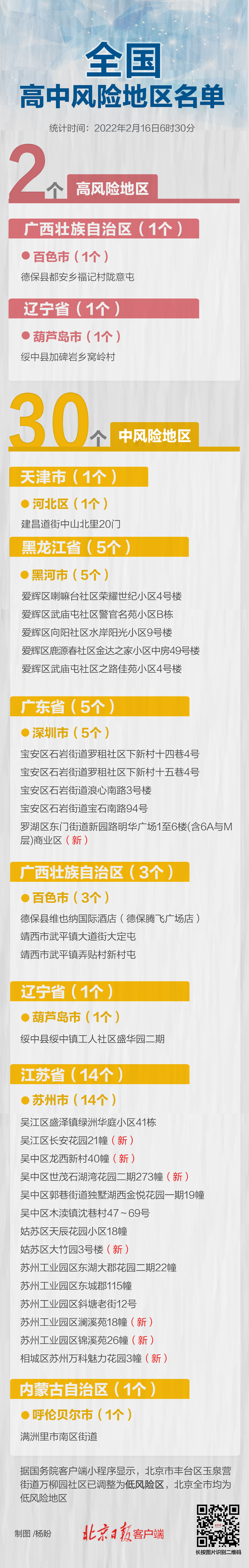 目前,全国共有高风险区2个,中风险区30个。