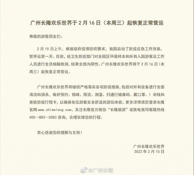 广州长隆旅游度假区官方微博@广州长隆 消息,2月15日上午,根据政府疫情防控要求,广州长隆欢乐世界暂停运营一天。目前,经卫生防疫部门对长隆欢乐世界全园区环境样本和所有入园游客及工作人员进行全员核酸检测,结果全部为阴性。广州长隆欢乐世界将于2月16日(本周三)起恢复正常营运。