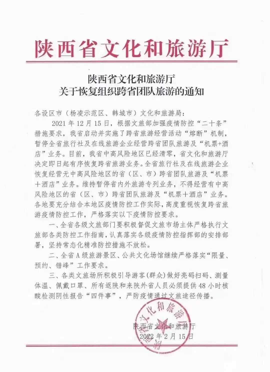 2月15日,陕西省文化和旅游厅发布《关于恢复组织跨省团队旅游的通知》(以下简称《通知》)。即日起,陕西省文化和旅游厅决定有序恢复跨省旅游业务,《通知》全文如下: