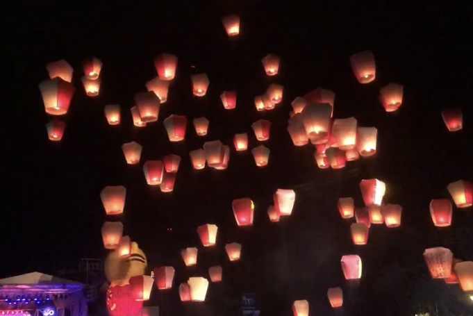 伴随着轻柔音乐声和阵阵欢呼声,新北市平溪中学操场,高达6米的“福虎”主灯和上百盏天灯次第升空,一片柔和的橘色将天空点亮。