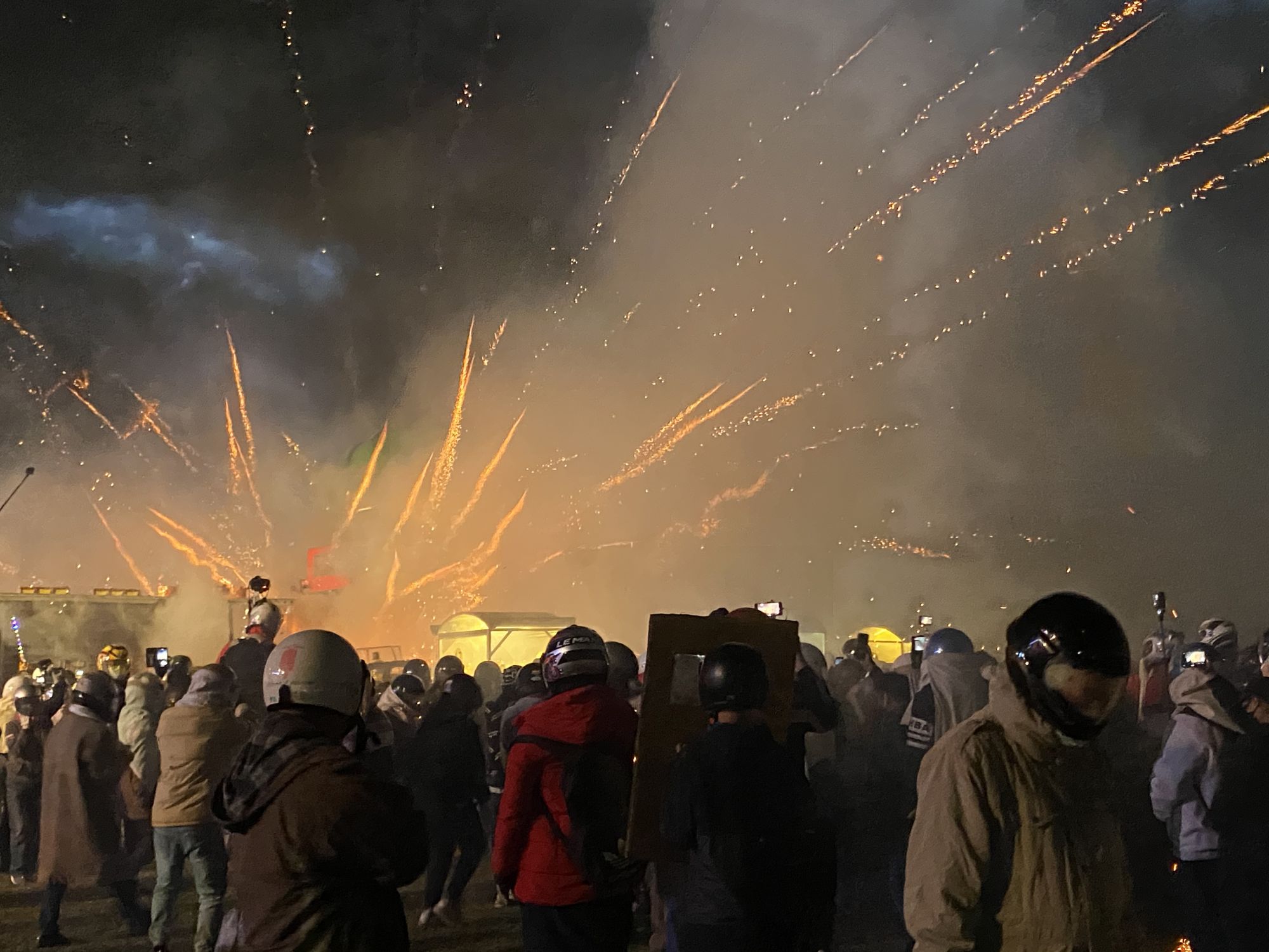 夜幕降临,民众纷纷涌入蜂炮施放处,顷刻间万炮齐发、震耳欲聋。“透过蜂炮洗礼,希望能消灾解难,疫情快快退散,新一年的运势越来越旺!”台南市民高先生在喧天蜂炮中许下了新年愿望。