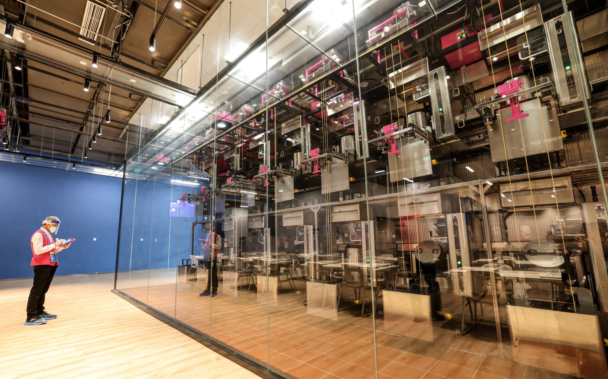 1月26日,一名工作人员正在主媒体中心媒体餐厅查看运菜机器人工作。新华社记者杨磊摄