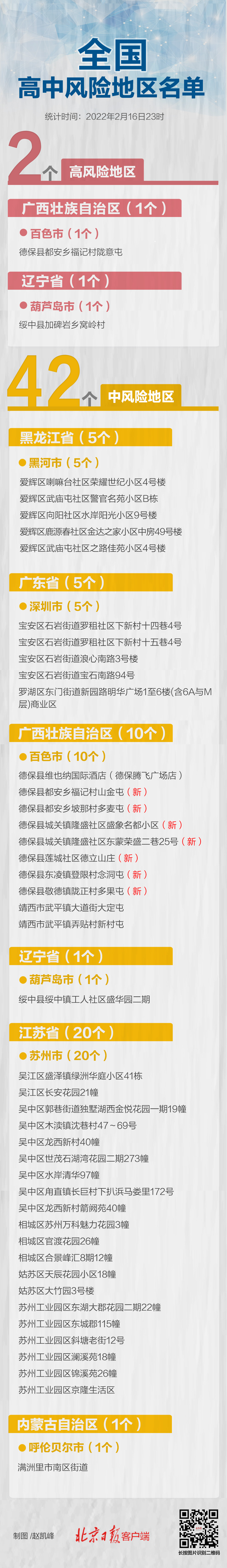 截至2月16日,广西百色德保县都安乡福记村山金屯、都安乡坡那村多麦屯、城关镇隆盛社区盛象名都小区、城关镇隆盛社区东蒙荣盛二巷25号、莲城社区德立山庄、东凌镇登限村念洞屯、敬德镇陇正村多果屯调整为中风险地区。