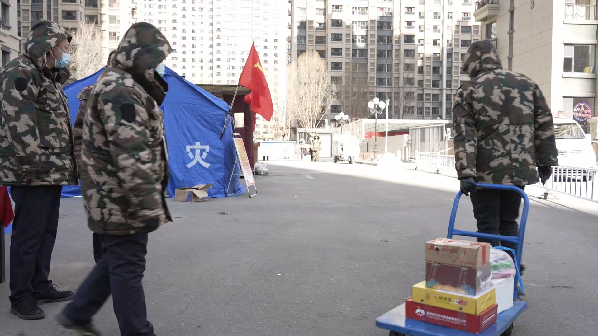 在这个封控小区门口,疫情防控工作人员高智在寒风中查验物资运输车辆,他说,小区内目前有2000余户居民,楼长每日收集居民的物资需求,由社区联系保供企业将物资配送到小区门口,统一消毒后送进小区。