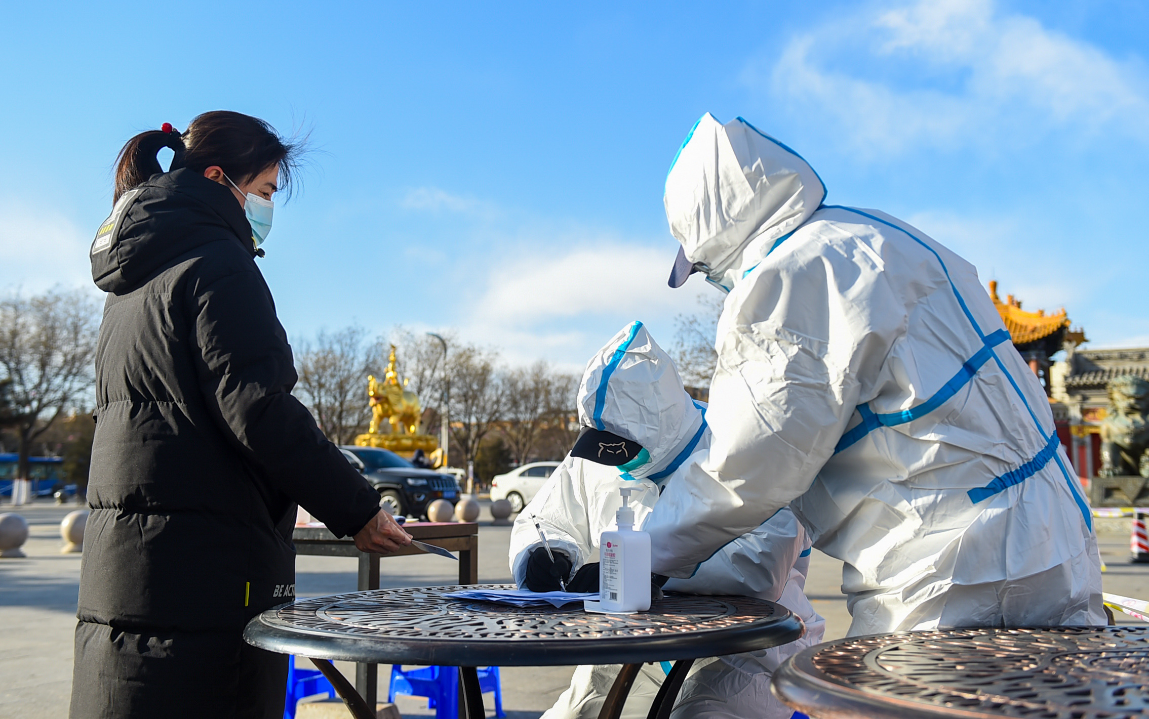 2月19日,在呼和浩特市玉泉区席力图召临时核酸采样点,工作人员登记信息。新华社记者 彭源 摄