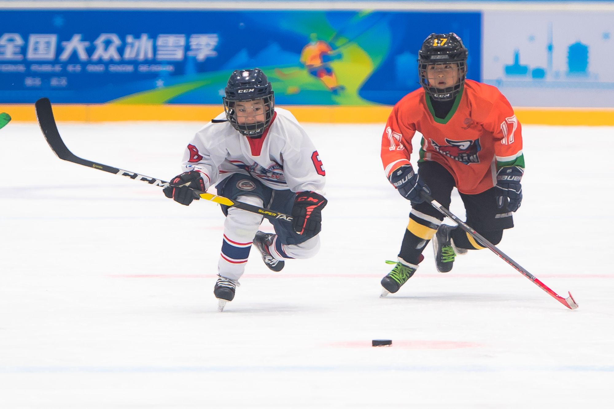 2021年12月19日,小球员在“滑向2022”全国青少年冰球系列赛(武汉站)的比赛中。新华社记者肖艺九摄
