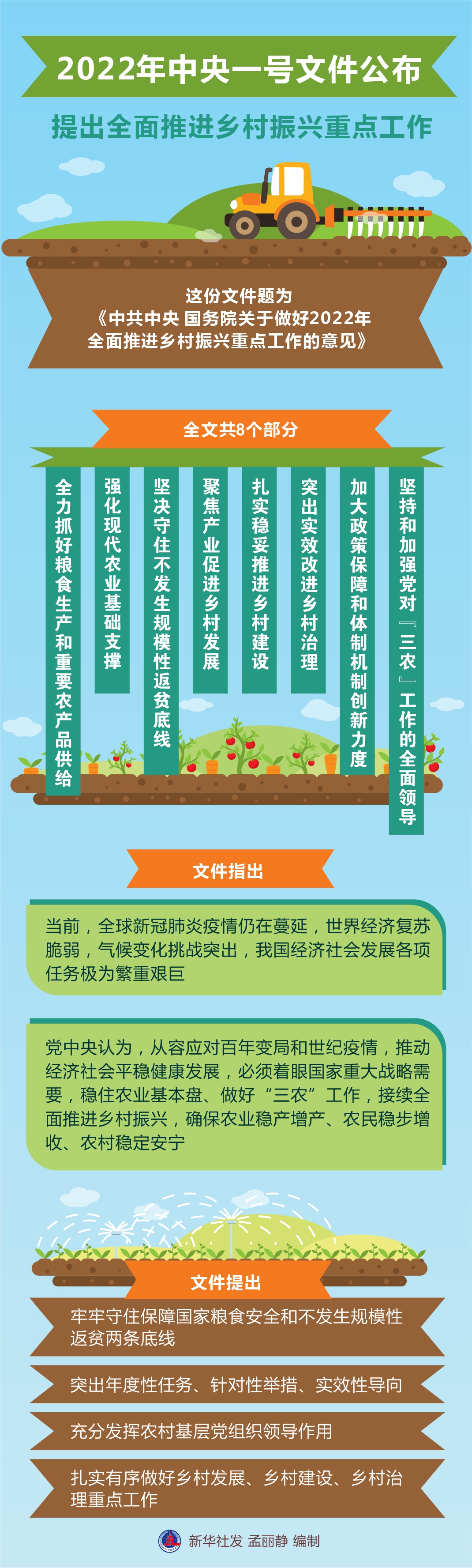 这份文件题为《中共中央 国务院关于做好2022年全面推进乡村振兴重点工作的意见》,全文共8个部分,包括:全力抓好粮食生产和重要农产品供给、强化现代农业基础支撑、坚决守住不发生规模性返贫底线、聚焦产业促进乡村发展、扎实稳妥推进乡村建设、突出实效改进乡村治理、加大政策保障和体制机制创新力度、坚持和加强党对“三农”工作的全面领导。