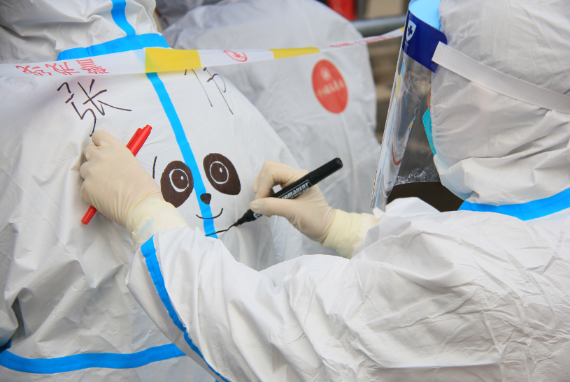 来自镇江的医务人员王艳闲暇时喜欢画画,采样开始前,她发挥特长,为“战友”们绘就一幅幅活灵活现的“大白图腾”,为紧张的采样工作带来了别样欢乐。