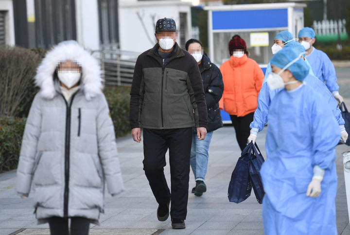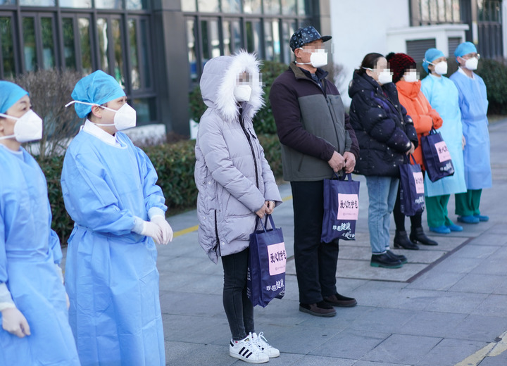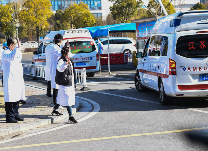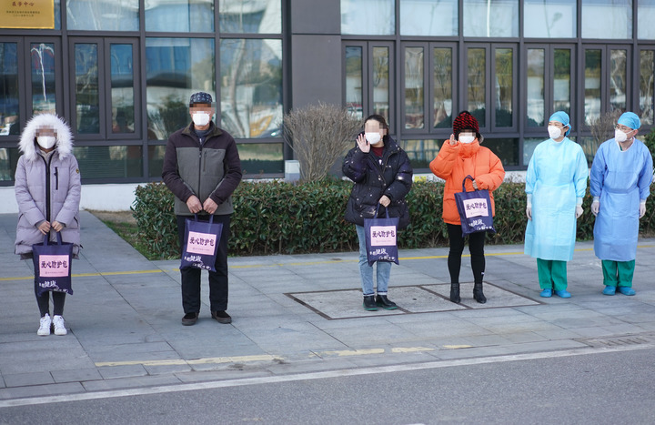 2月24日,4名身穿棉服的治愈患者戴着口罩走出江苏省苏州市新冠肺炎定点收治医院大门,转身与医护人员挥手致意。医护人员为他们送上了装有一次性外科口罩、化痰利咽茶包、消毒湿巾及防疫宣传材料的爱心防护包,目送他们踏上救护车,转院进行康复管理。