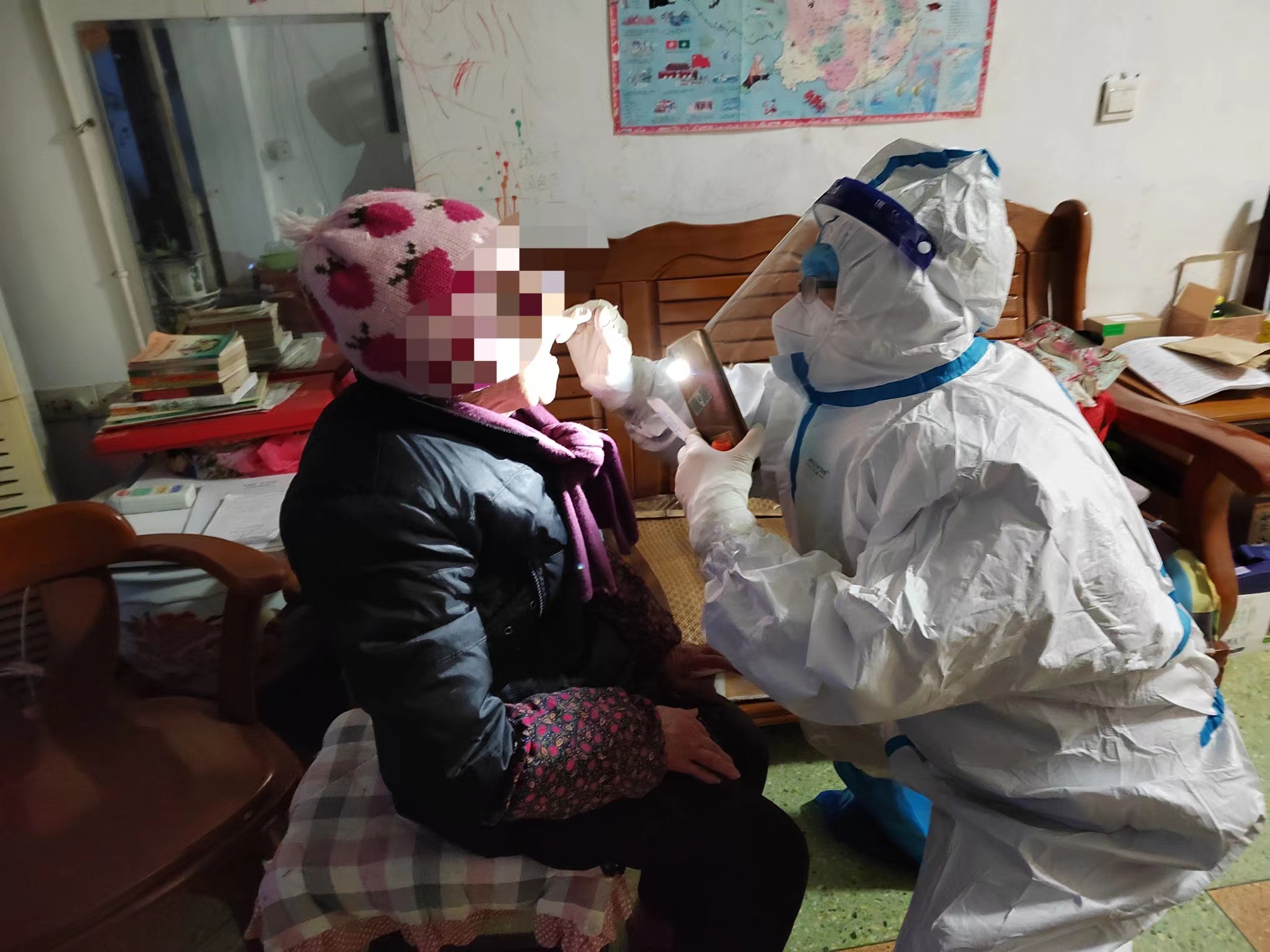 “婆婆别怕,张开嘴!”“说‘啊……’”为90多岁的独居老人刘学林做完核酸检测后,医务人员还细心叮嘱她:“婆婆,这几天冷,有啥需要就给社区打电话,自己就别出门了。”
