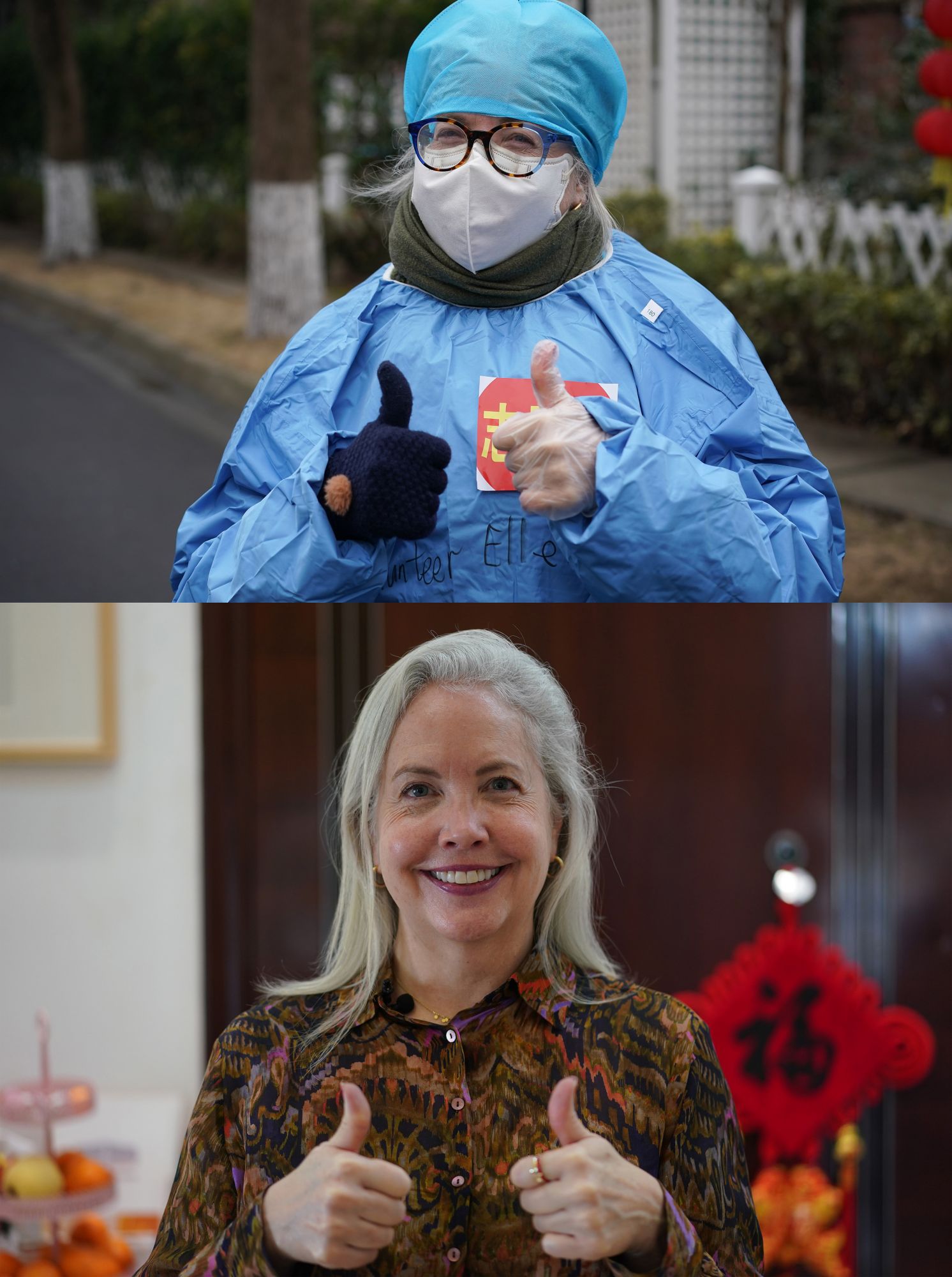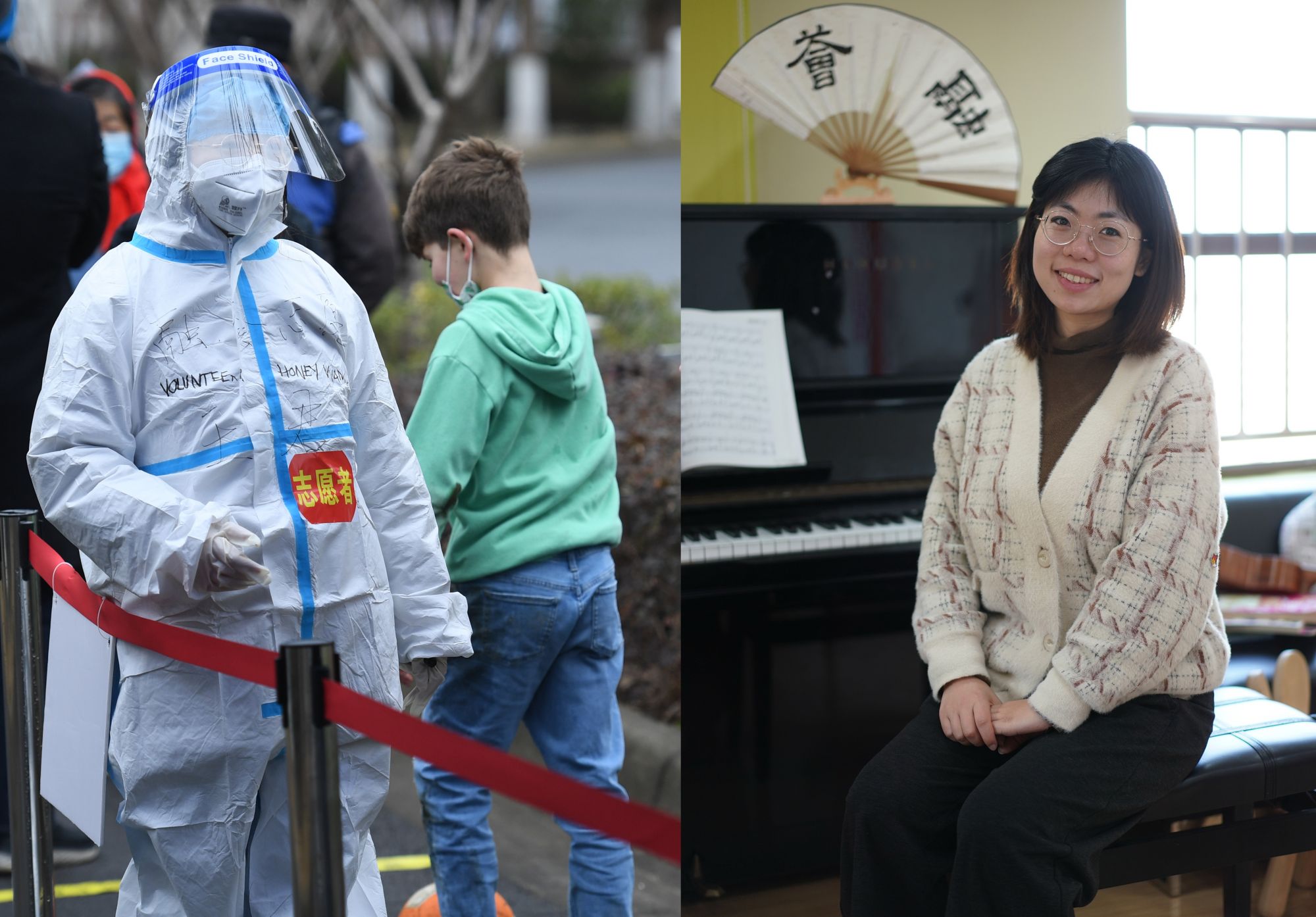 ↑拼版照片:上图为在苏州工业园区西湖社区青湖丽苑小区核酸采样点,美国志愿者施爱伦在为苏州加油(2月18日摄);下图为施爱伦在融荟文化交流中心(2月21日摄)。施爱伦是当地融荟文化交流中心国际志愿者团队成员。作为志愿者,她在小区核酸采样点帮助外籍人士登记信息、维持秩序、讲解注意事项。