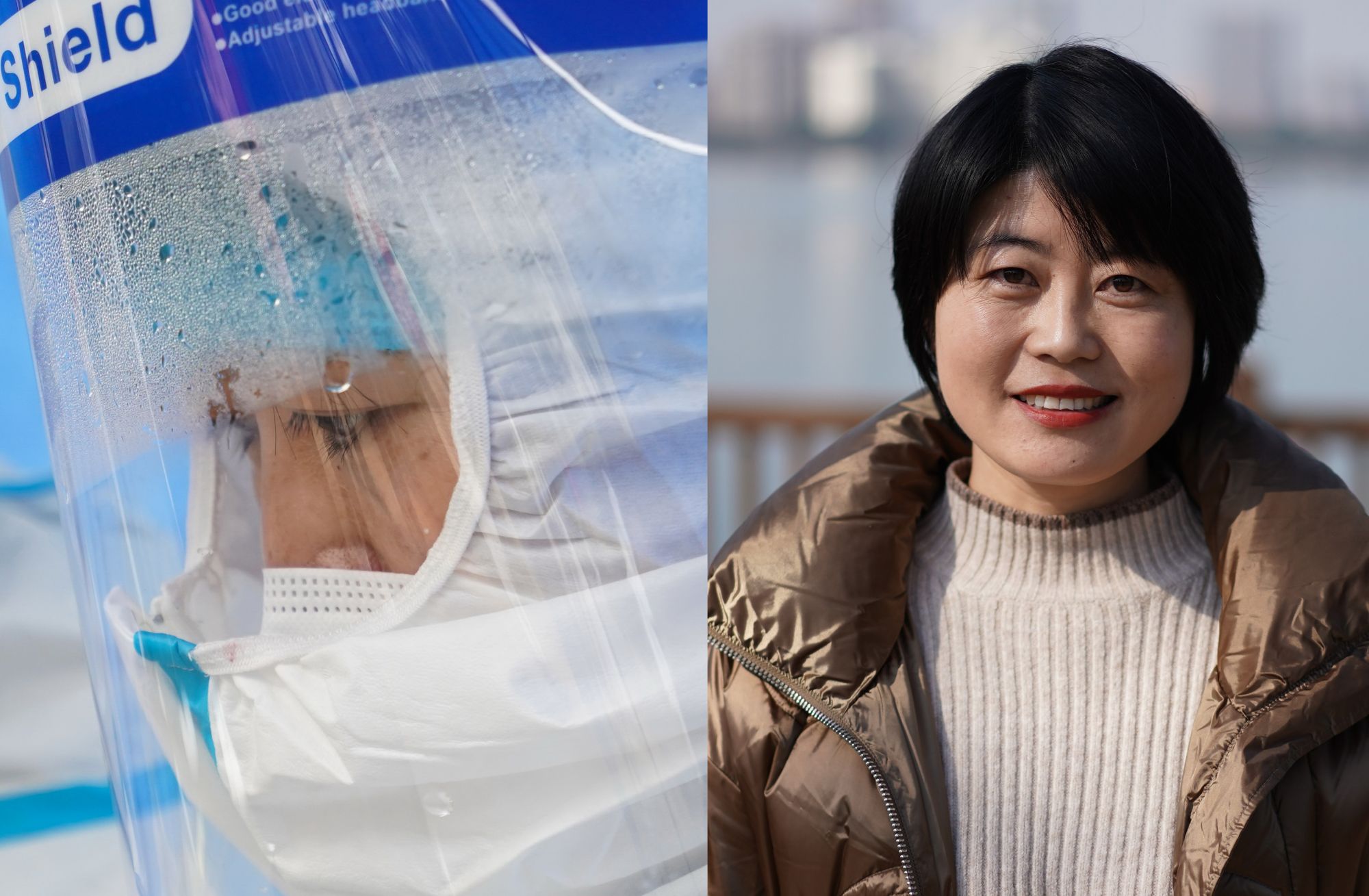 ↑拼版照片:左图为在苏州工业园区西湖社区青湖丽苑小区核酸采样点,志愿者王君在工作(2月18日摄);右图为王君在融荟文化交流中心(2月21日摄)。