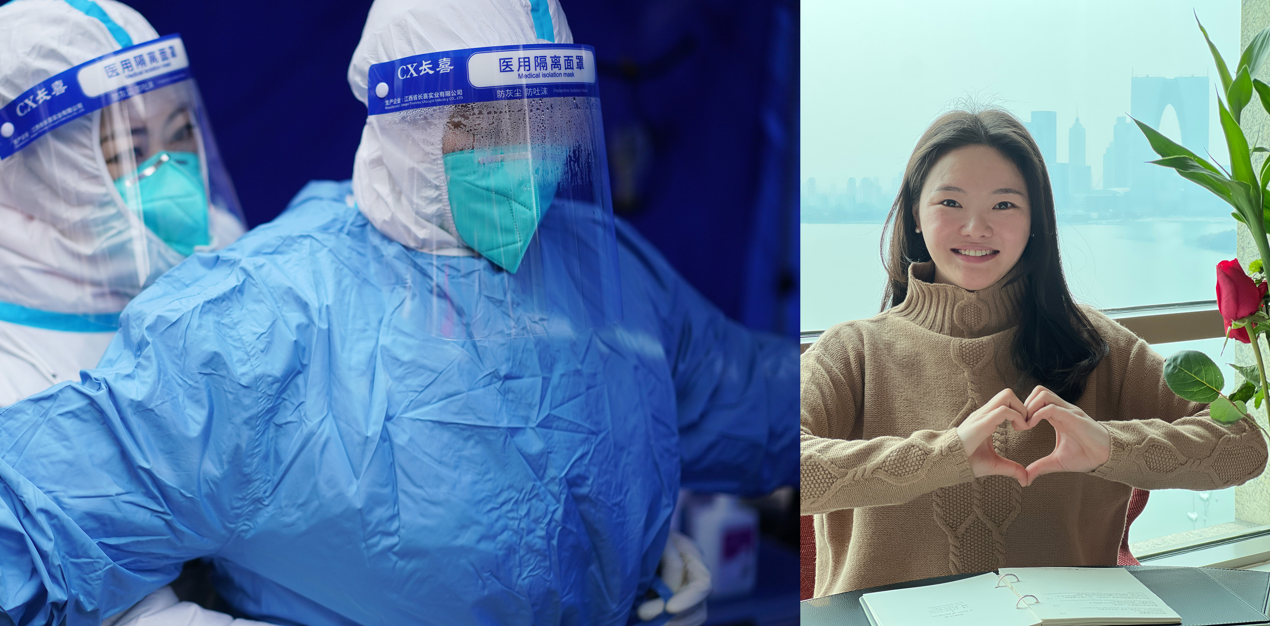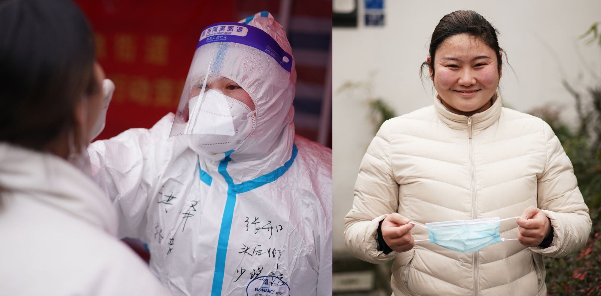 ↑拼版照片:左图为在苏州工业园区西湖社区青湖丽苑小区核酸采样点,护士朱明星(前)穿上隔离服,准备上门进行核酸采样(2月22日新华社记者季春鹏摄);右图为朱明星在酒店房间为苏州人民和抗疫人员“比心加油”(2月22日摄,受访者提供)。朱明星2008年经历过汶川大地震,她说,“我想尽自己的绵薄之力,报答社会。我一个人是微不足道的,但是大家齐心协力,点点星火定将汇聚成必胜光芒。”