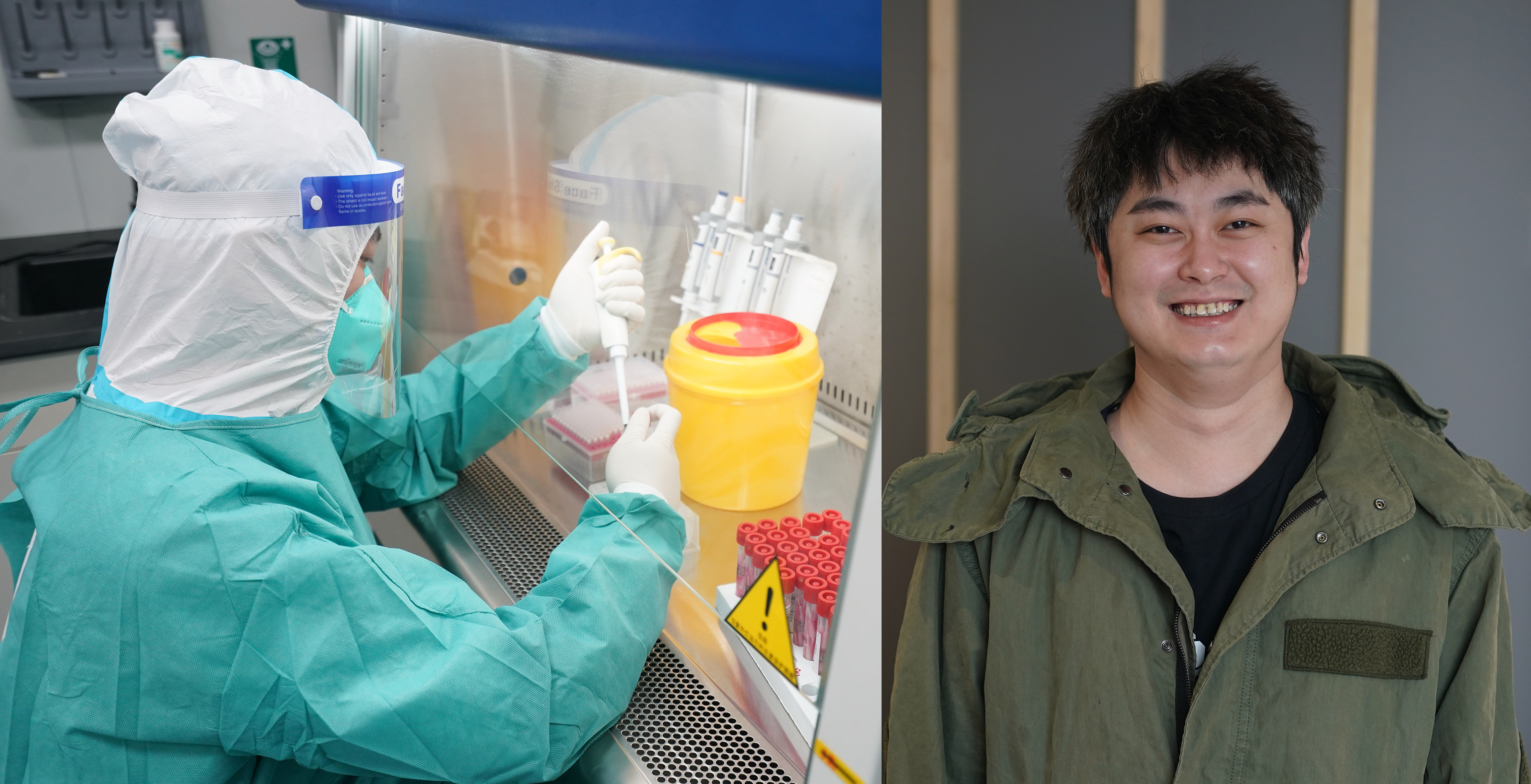 ↑拼版照片:左图为在爱普益(苏州)医学检验实验室有限公司,耿岳在样本制备区忙碌(2月17日摄);右图为耿岳在苏州高新区一家酒店的房间内(2月23日摄)。耿岳和同事于2月14日从北京总部来到苏州分公司,增援核酸检测工作。