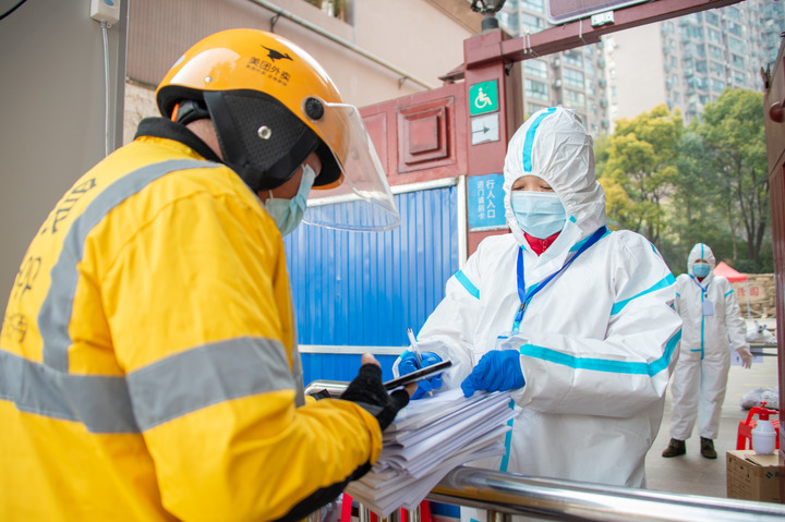 2月24日,武汉市江岸区华清园小区实施封控管理,配送人员将一份考试资料送到小区门口,由社区志愿者转交给居民。新华社记者伍志尊 摄