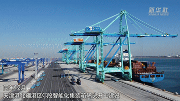 2021年,天津港北疆港区C段智能化集装箱码头正式投产运营。
