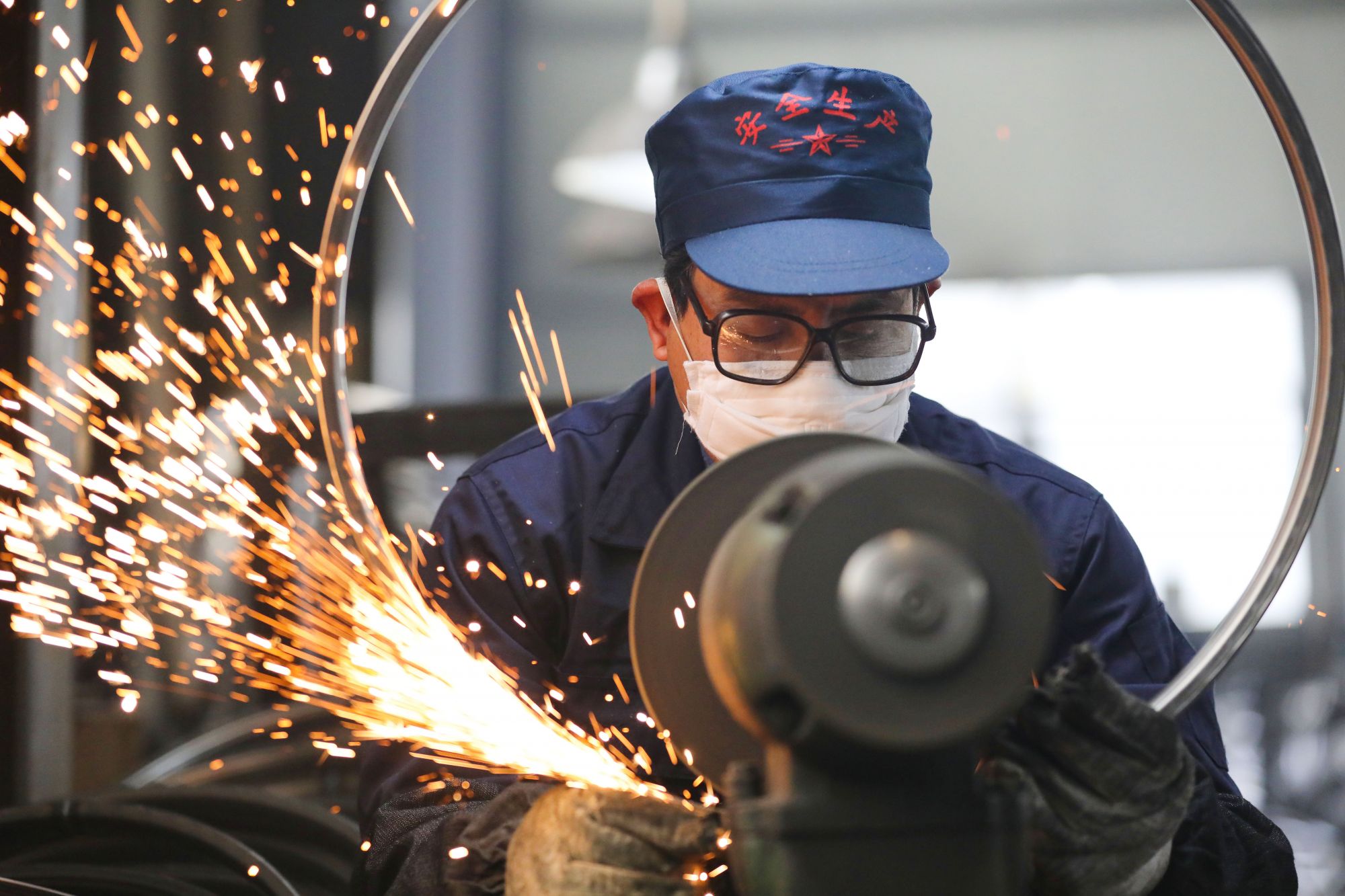 2月7日,在浙江省杭州市临安区天目山镇一家外贸企业,工人在抛光自行车钢圈。新华社发 胡剑欢 摄