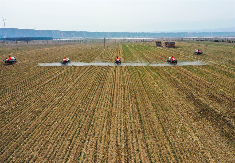 2月22日,高地隙植保机在山西省运城市芮城县新村作业(无人机照片)。新华社记者 柴婷 摄