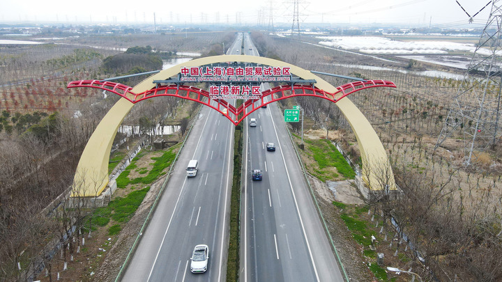 S2沪芦高速上的中国(上海)自由贸易试验区临港新片区“海鸥门”(2022年2月10日摄,无人机照片)。新华社记者 方喆 摄