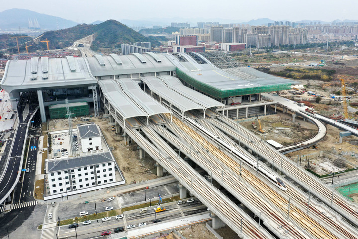 从浙江嵊州新昌站开出的杭台高铁首发列车停靠台州站后驶出,开往温岭方向(2022年1月8日摄,无人机照片)。新华社记者 黄宗治 摄