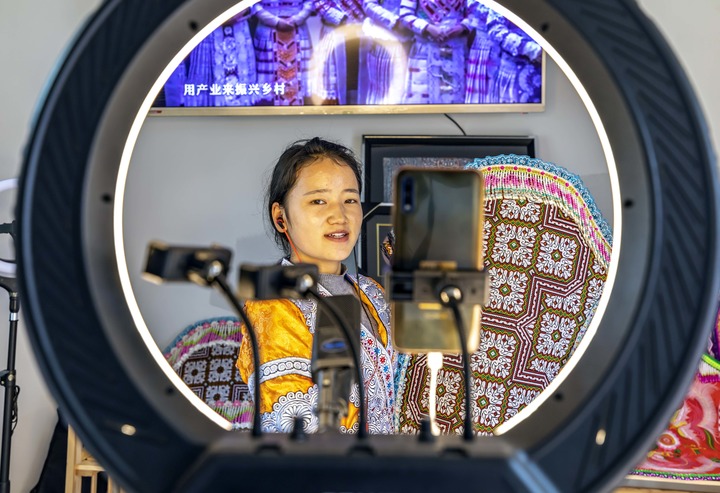 几千公里外,贵州毕节,“悬崖下的村寨”化屋村里,青春靓丽的“阿哥阿姐”借助电商直播,让特色苗绣源源不断飞出深山,走向全国。