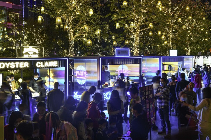 市民在广州夜经济集聚区天德广场天德快闪街品尝美食(2021年12月10日摄)。新华社记者 刘大伟 摄