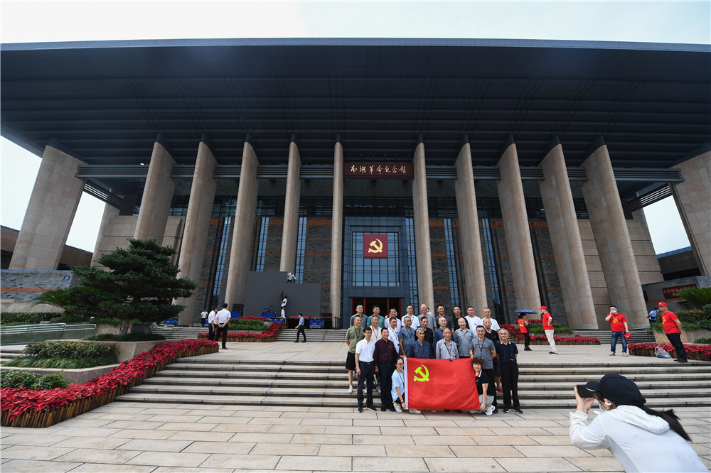 2021年6月30日,参观者在浙江嘉兴南湖革命纪念馆前合影。新华社记者 徐昱 摄